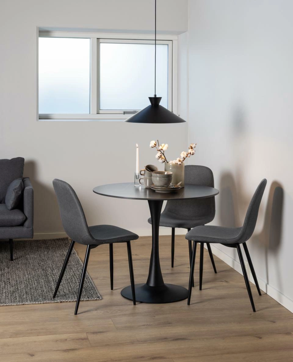 Jídelní židle Celia od značky Actona je dokonalým spojením skandinávského minimalismu a moderní funkčnosti. Čalouněný šedý sedák a černé kovové nohy s matnou úpravou dodávají židli univerzální, elegantní vzhled. Díky kompaktním rozměrům (výška 86 cm, šířka 44 cm, hloubka 54 cm) a vyššímu sedáku je pohodlná jak při rodinných večeřích, tak i při dlouhých posezeních u stolu.