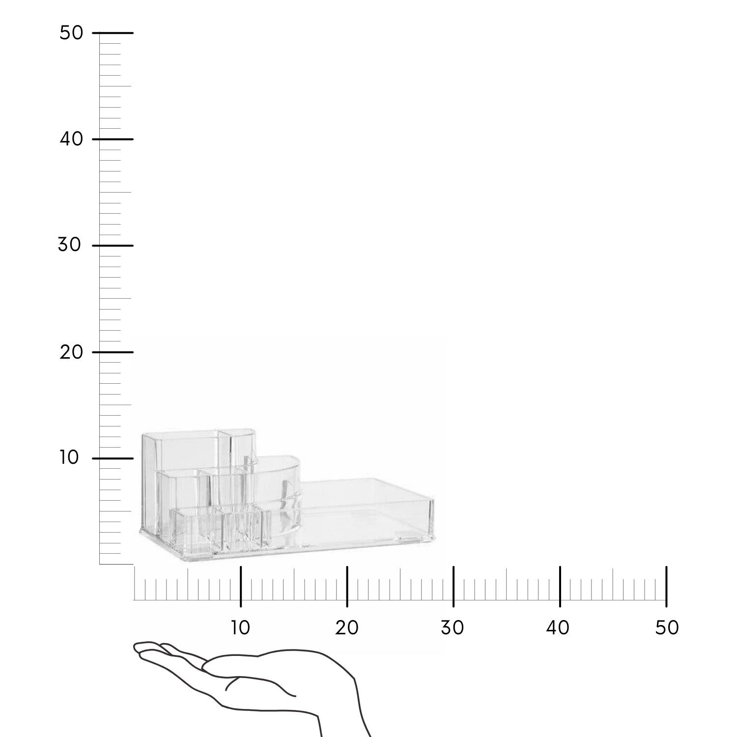 Organizer na kosmetiku Selena od značky 5five simply smart je praktickým a nadčasovým doplňkem na kosmetický stolek nebo do koupelny, vyrobený z transparentního polystyrenu a silikonu. Byl navržen s ohledem na pohodlné ukládání oblíbených kosmetických produktů – disponuje až 8 samostatnými přihrádkami, které pomohou uspořádat jak drobné pomůcky, tak větší kosmetiku. Díky kompaktní šířce 17,3 cm se organizer skvěle hodí i na menší plochy stolku či police.