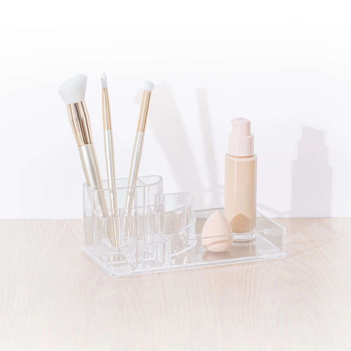 Průhledný organizer Selena umožňuje rychle najít požadovaný kosmetický produkt a zároveň udržuje pořádek v prostoru pro líčení. Promyšlené rozmístění přihrádek poskytuje místo na štětce, řasenky, rtěnky, laky i korektory – bez rizika převrácení nebo ztráty. Ať už organizer umístíte na kosmetický stolek, do koupelny nebo zásuvky, vaše kosmetika bude vždy přehledně seřazená a snadno dostupná.