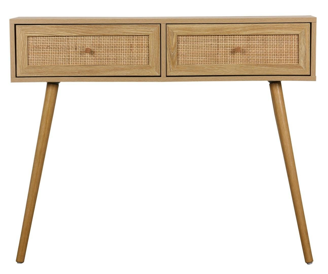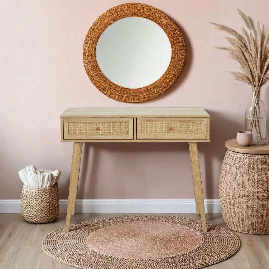 Konzole se zásuvkami Ballo od značky Intesi je kombinací přírodního ratanu a borovicového dřeva v lehkém, boho stylu. Úzký přístavný stolek o šířce 100 cm a hloubce 29 cm nabízí funkčnost i v menších prostorech, zatímco dvě praktické zásuvky s pletenou čelní stranou umožňují pohodlné uschování drobností. Jde o ideální řešení jako konzole do předsíně, stolek do obýváku nebo moderní toaletní stolek do ložnice.
