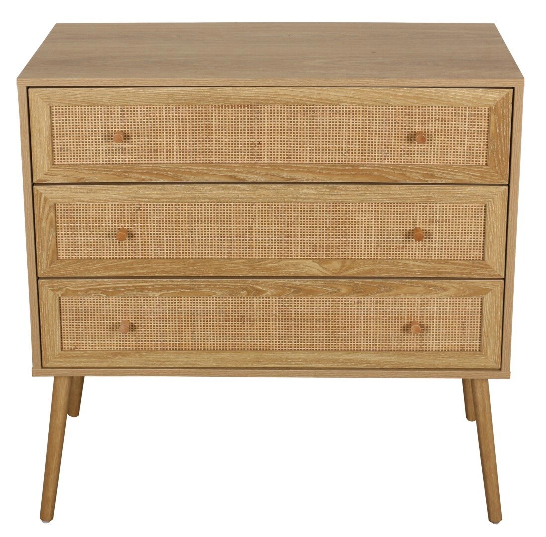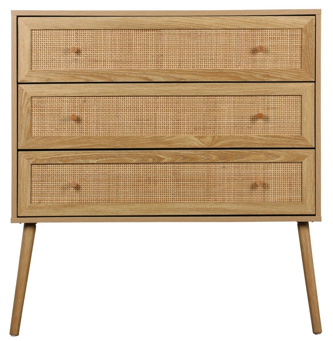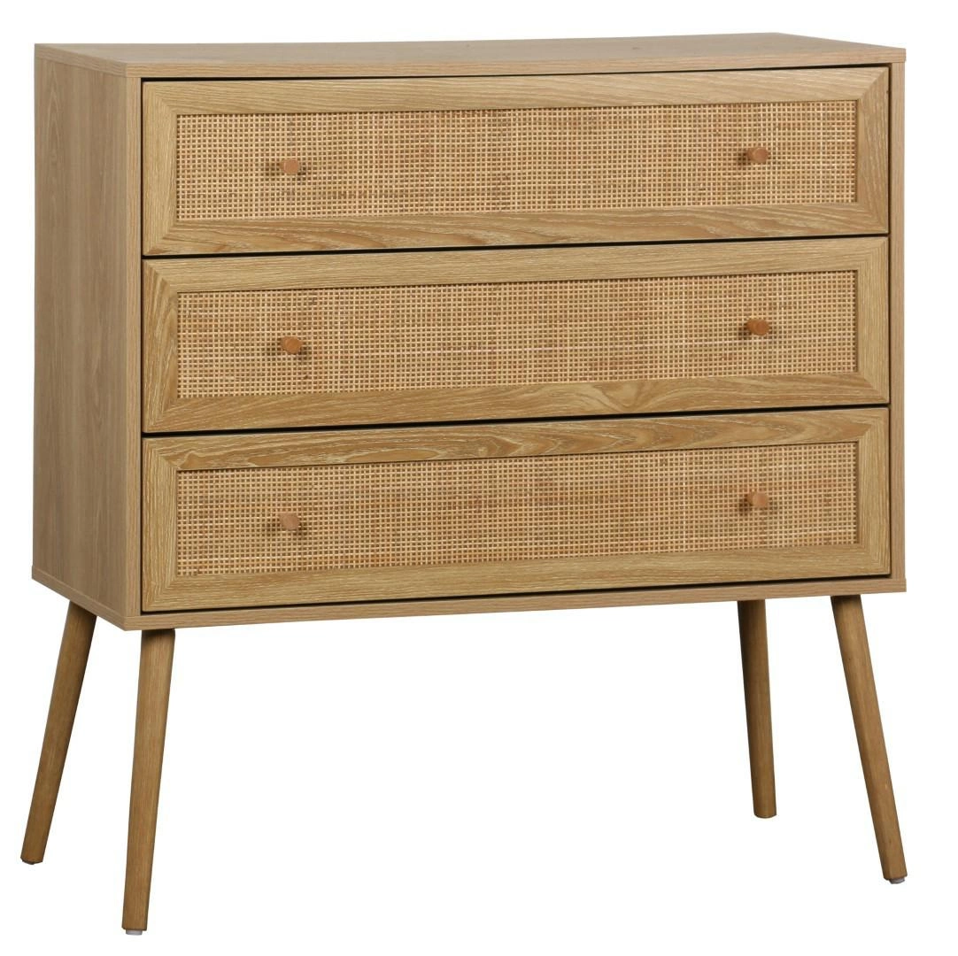 Komoda Ballo od značky Intesi je stylovou volbou pro milovníky přírodních materiálů a jemného designu. Vyrobena z borovicového dřeva a ratanu, vybavena třemi prostornými zásuvkami, představuje praktický i dekorativní doplněk do obývacího pokoje nebo ložnice. Šířka 90 cm a výška 79 cm umožňují snadno uložit potřebné textilie, dokumenty či doplňky.
