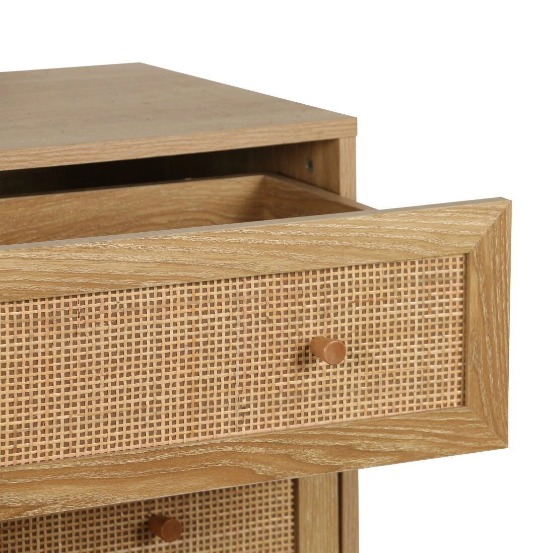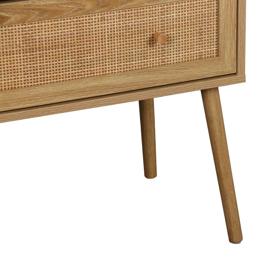 Čela z ručně pleteného ratanu a teplý, přírodní odstín dřeva dělají z komody Ballo poutavý prvek, který do vašeho domova vnese harmonickou atmosféru. Ideální volba pro zařízení v boho stylu, kde je důležitá autentičnost a blízkost přírody. Polomatný povrch podtrhuje lehkost nábytku, díky čemuž se komoda hodí jak do světlých, tak do výraznějších interiérů.