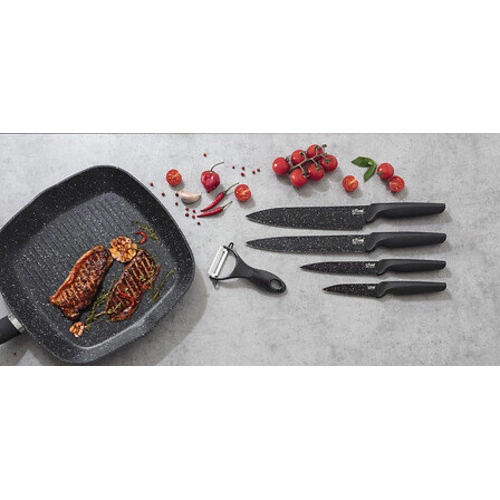 Minimalistická černá barva dodává sadě výjimečnou eleganci a perfektně se hodí jak do moderní, tak do klasické kuchyně. Nože jsou vyrobeny z kvalitní nerezové oceli s keramickým povrchem, který je chrání před korozí a zabarvením, což zaručuje dlouhou životnost. Lehká konstrukce a ergonomicky tvarované rukojeti poskytují jistý úchop a pohodlí při každodenním používání, i při intenzivním vaření.