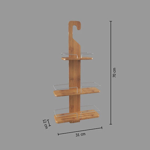 Koupelnová polička do sprchy 5five simply smart Bambou je třípatrové závěsné řešení z přírodního bambusového dřeva, vybavené praktickými háčky. Díky kompaktním rozměrům – 70 cm na výšku, 31 cm na šířku a 12 cm do hloubky – se snadno vejde i do menší sprchové kabiny nebo nad vanu. Výjimečná odolnost, potvrzená certifikátem FSC, a pečlivě vybrané materiály z ní dělají funkční a stylový doplněk každé koupelny.