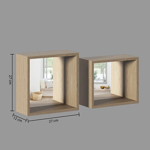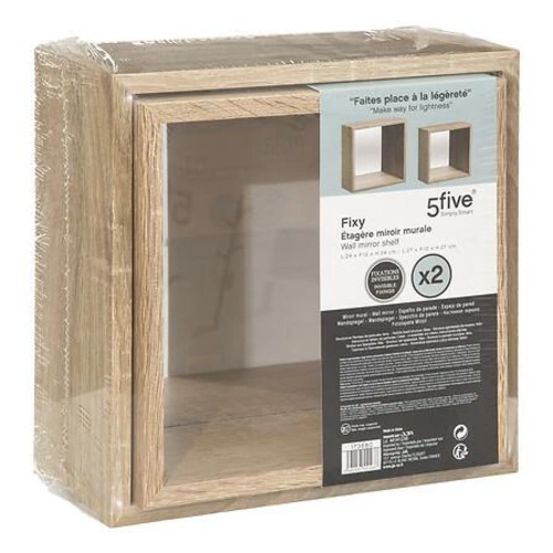 Sada 2 nástěnných polic Fixy od značky 5five simply smart je harmonickým spojením přírodního dubového dekoru a elegantního zrcadla v moderním, čtvercovém tvaru. Police vyrobené z odolné MDF desky a skla o rozměrech 24x24x12 cm a 27x27x12 cm jsou skvělou volbou jako dekorativní i praktický prvek do obývacího pokoje, ložnice nebo předsíně. Tento set moderních nástěnných polic nabízí ideální řešení pro vystavení oblíbených dekorací, knih či rostlin a zároveň opticky zvětšuje a prosvětluje prostor díky zadní stěně se zrcadlem.