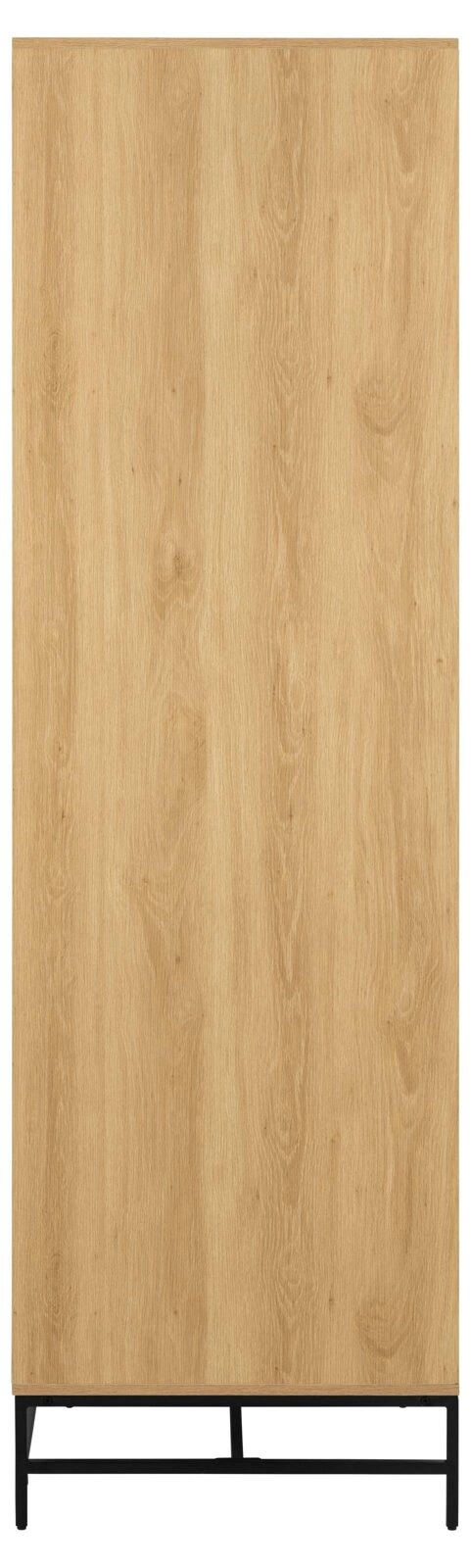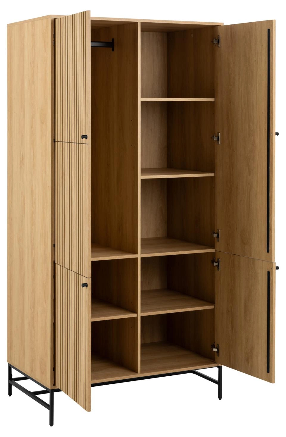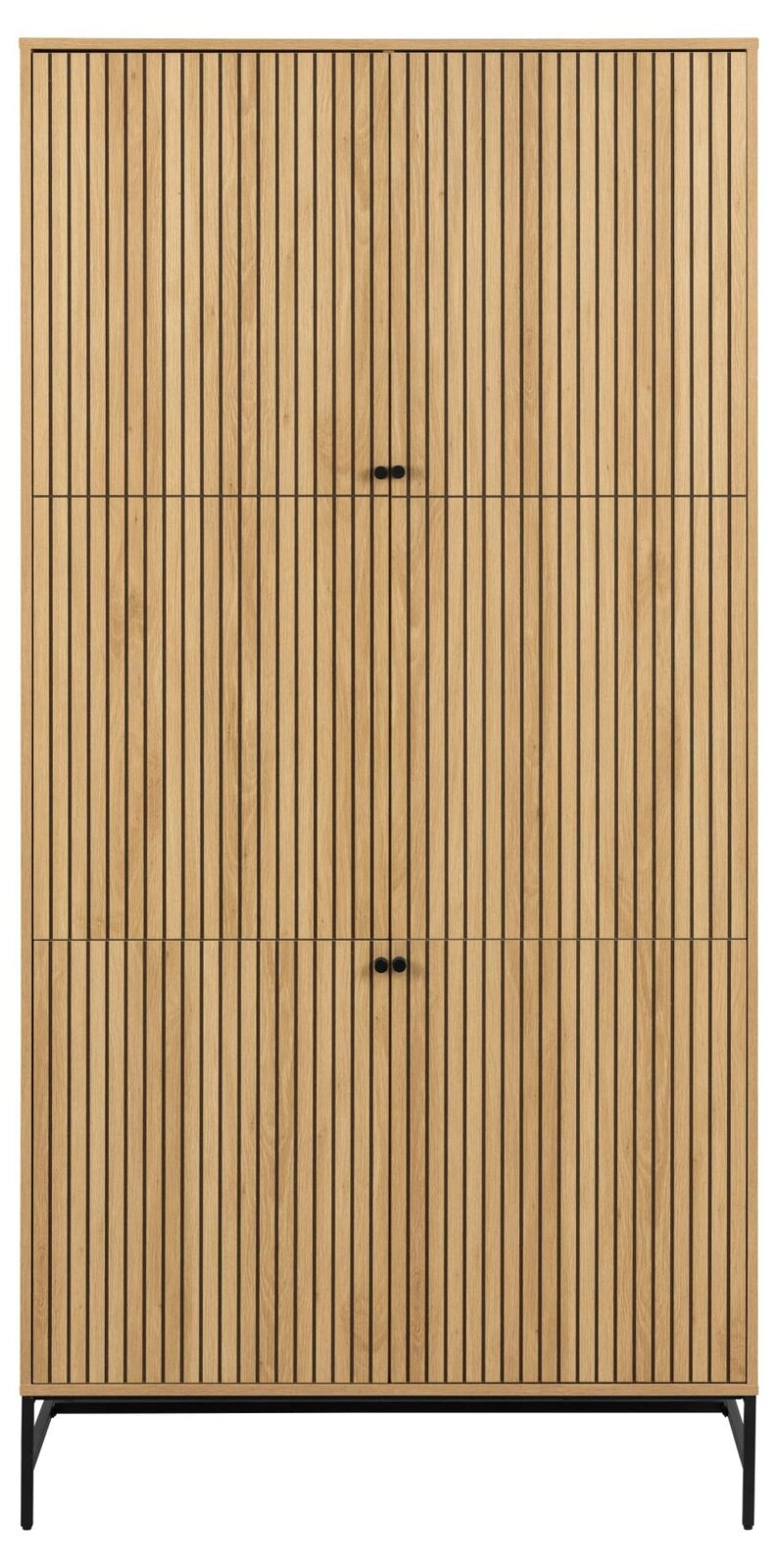 Šatní skříň Albany je moderní skříň s drážkovanými dvířky v přírodním dubu, která skvěle zapadne do ložnice nebo šatny. Nábytek o rozměrech 200 cm na výšku, 99 cm na šířku a 60 cm do hloubky nabízí až 6 prostorných polic a 2 uzavíratelné skříňky, což zajišťuje funkční úložný prostor na oblečení i doplňky. Ocelová černá podstava podtrhuje její současný design a polomatná povrchová úprava usnadňuje údržbu čistoty.