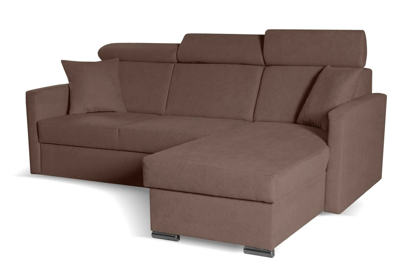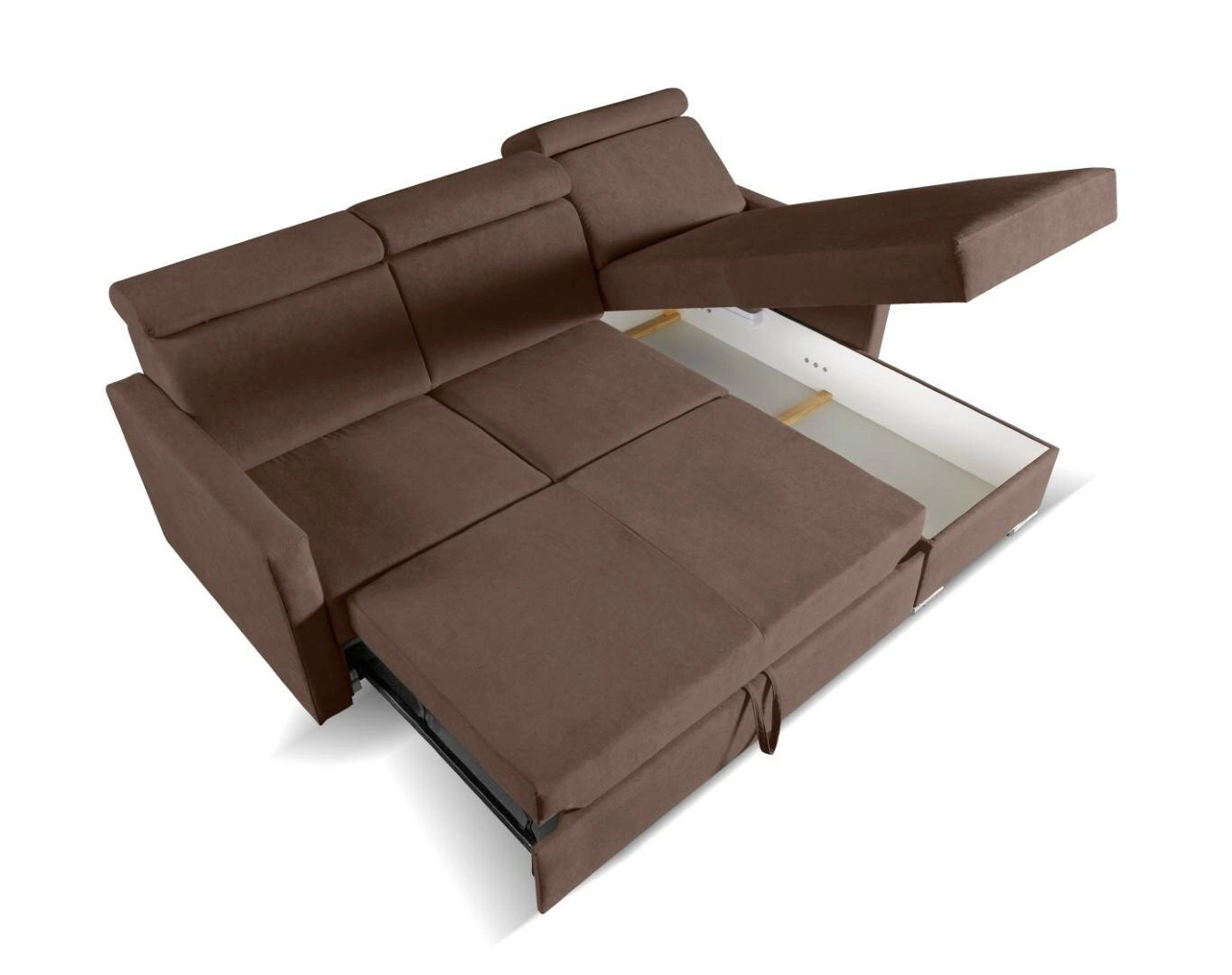 Moderní rohová sedačka s rozkládací funkcí a úložným prostorem Mils hnědá od značky Intesi je ideální volbou pro ty, kteří hledají praktické a stylové řešení do obývacího pokoje. Potažená měkkou, sametovou látkou Soro v hlubokém odstínu hnědé nabízí pohodlné posezení s výplní z vlnitých pružin a čalounické pěny. Tento rozkládací model s prostorným úložným prostorem na lůžkoviny snadno přizpůsobíte svým potřebám – k dispozici je ve variantě levé i pravé strany.