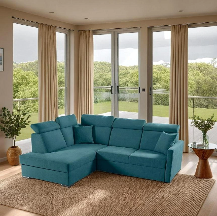 Rohová sedací souprava s funkcí spaní Mils XL levostranná od značky Intesi je ideální volbou pro ty, kteří hledají harmonické spojení skandinávského stylu, pohodlí a každodenní praktičnosti. Tento model, čalouněný sametovou látkou v originální mořské barvě, nabízí prostor k relaxaci pro tři osoby a pohodlnou spací plochu o rozměrech 120×195 cm. Další výhodou je praktický úložný prostor na ložní prádlo, který pomáhá udržet pořádek v obýváku.