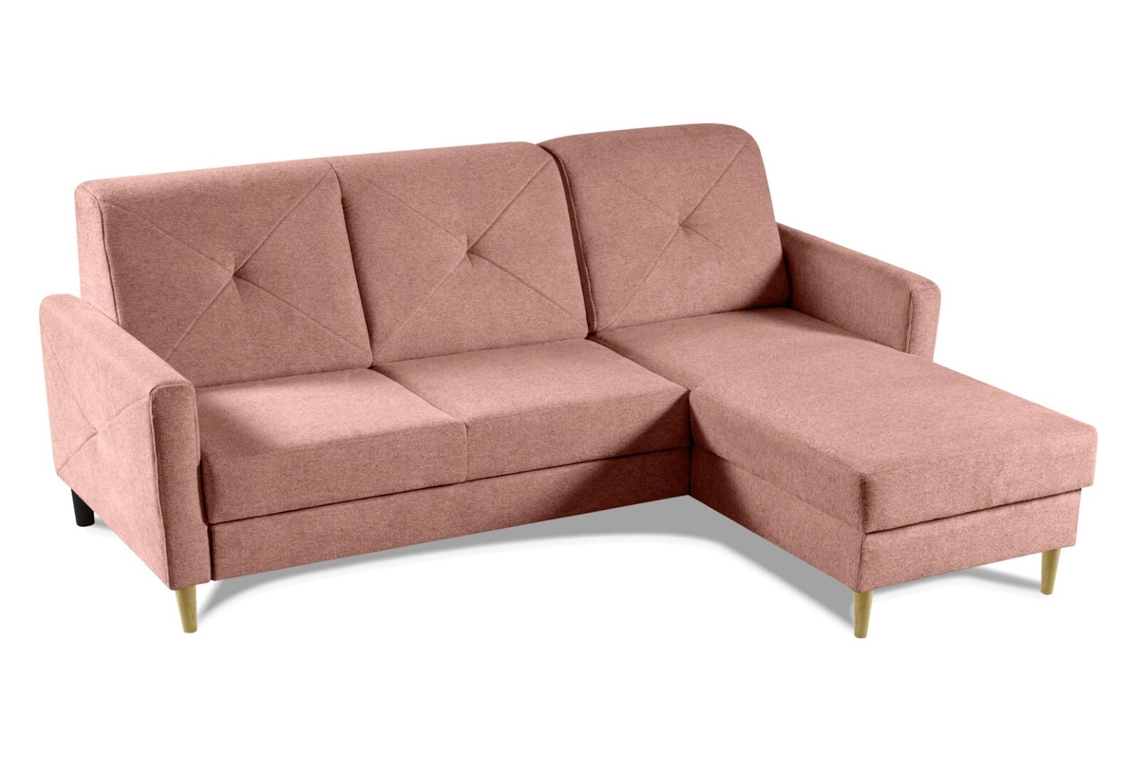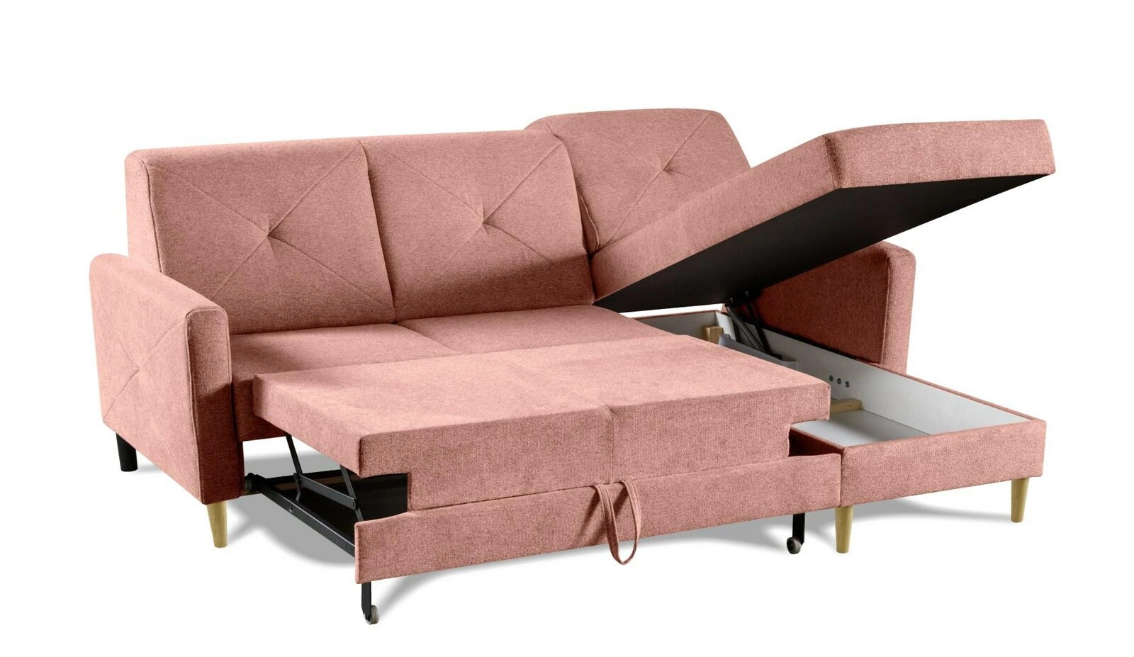 Rohová sedačka s rozkládací funkcí Scandi od značky Intesi je spojením moderního designu, pohodlí a praktičnosti. Tento levostranný rohový gauč v sametovém růžovém provedení nabízí prostor pro 3 osoby, rozkládací plochu na spaní 120×194 cm a úložný prostor na lůžkoviny. Díky pevné konstrukci z bukového dřeva a vlnitým pružinám v sedáku představuje odolnou a stylovou volbu do obývacího pokoje nebo studentského pokoje.