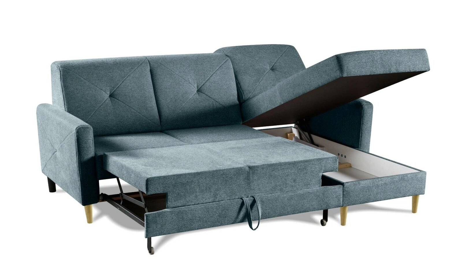 Rohová sedačka Scandi s funkcí spaní je vybavena mechanismem DL, který umožňuje rychlé rozložení na spací plochu o rozměru 120×194 cm – praktické řešení, pokud potřebujete další místo na spaní pro hosty nebo pro každodenní využití. Velký úložný prostor na lůžkoviny pomáhá udržet pořádek a mít potřebné textilie vždy po ruce. Vysoké a stabilní nohy zvýrazňují lehkost celé konstrukce a umožňují snadný průjezd robotického vysavače pod sedačkou.
