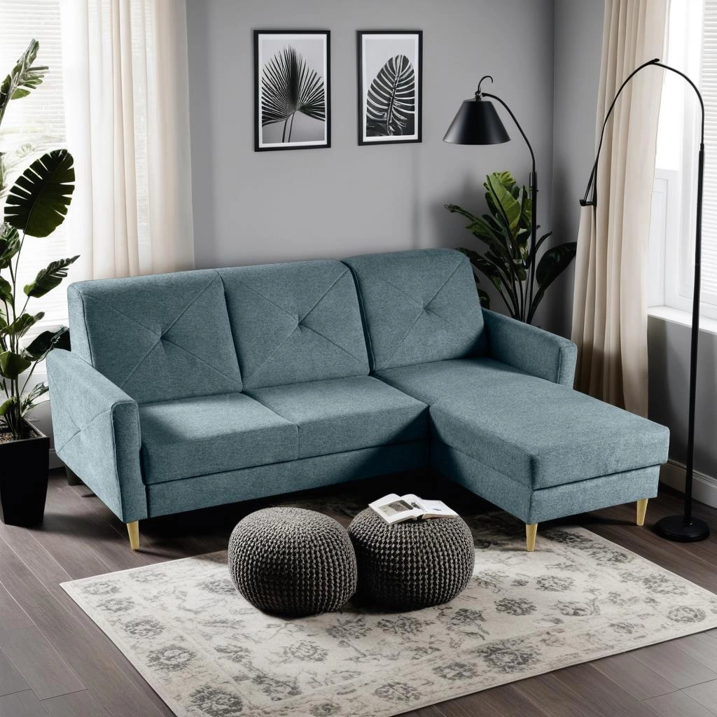 Modulární modrý rohový gauč Scandi ve skandinávském stylu s rozkladem a úložným prostorem do obýváku