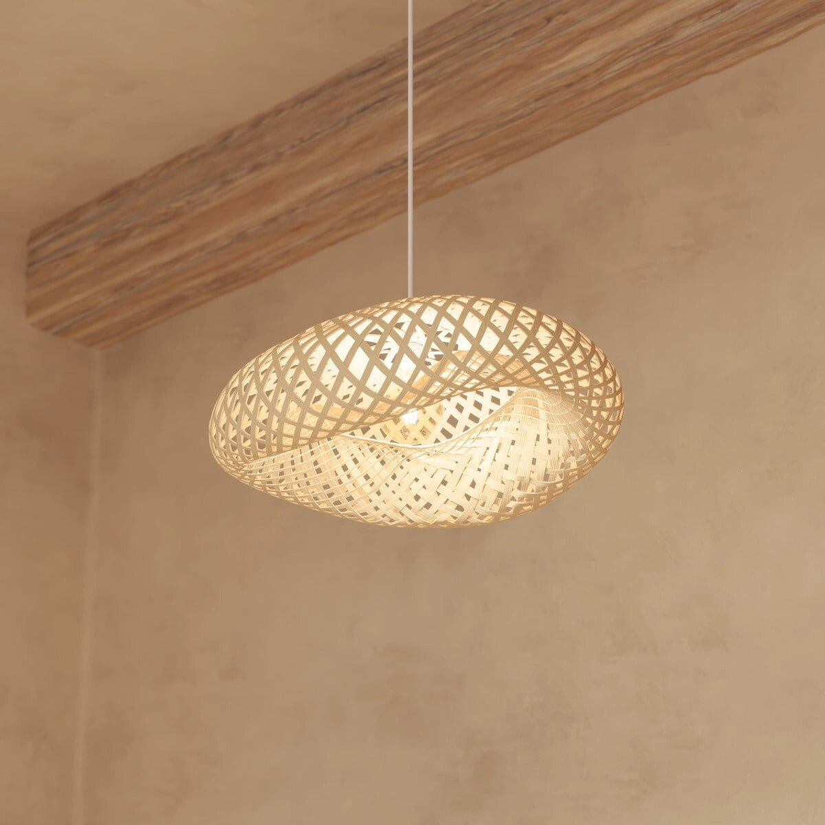 Pokud toužíte po interiéru ve stylu boho, závěsná lampa Beddy se stane jeho srdcem. Ručně pletené stínidlo z bambusu rozptyluje světlo měkkým a přirozeným způsobem a vytváří na stěnách i stropě efektní hru stínů. Tento efekt přispívá k relaxaci a dělá každé posezení u stolu nebo večer s knihou ještě magičtější. Ideální volba pro ty, kdo oceňují harmonii s přírodou a originální design.