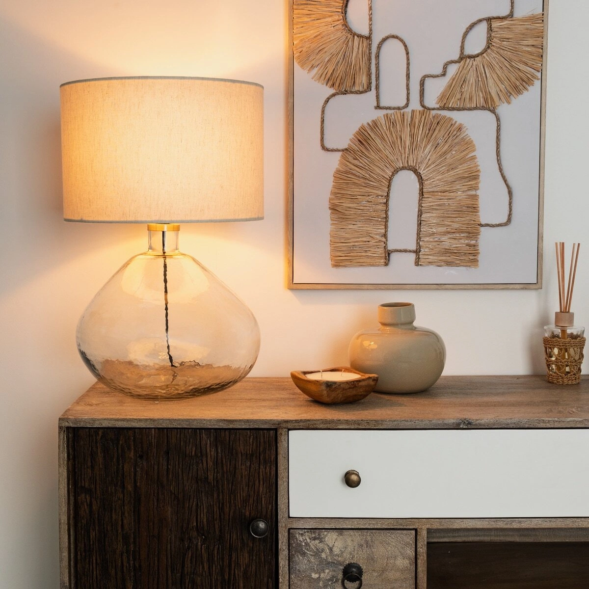 Lampička Melly je perfektní pro ty, kteří mají rádi minimalistickou eleganci a světlé, útulné prostředí. Průhledná skleněná základna jemně odráží světlo a vytváří příjemnou záři, která podporuje relaxaci. Bílé stínidlo z přírodní bavlny rozptyluje světlo rovnoměrně a poskytuje měkké, neoslňující osvětlení – proto je Melly skvělou volbou jako noční lampička na čtení nebo stolní lampa pro večerní odpočinek.