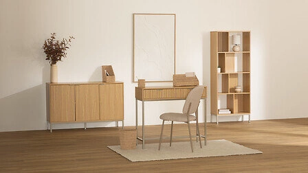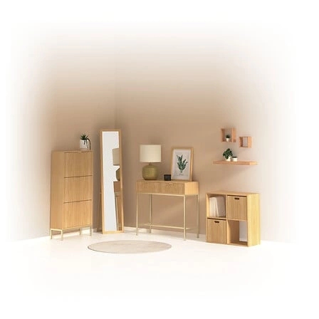 Konzole Tasso od značky Atmosphera je moderní konzolový stolek o šířce 80,5 cm, vyrobený z přírodní dýhy na pevném horním panelu a doplněný zlatými kovovými nohami. Praktická zásuvka a rýhovaná čelní strana podtrhují eleganci nábytku, díky čemuž je funkčním doplňkem do předsíně, obývacího pokoje nebo ložnice. Úzký tvar a obdélníková deska zajišťují, že konzole Tasso se skvěle hodí i do menších interiérů, kde poslouží jako nástěnný stolek nebo stylový toaletní stolek.