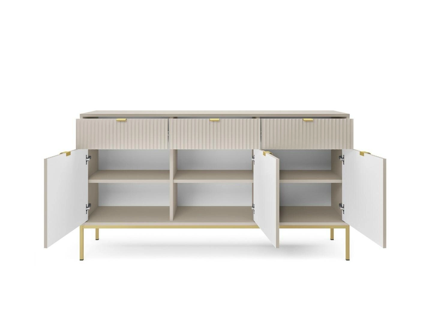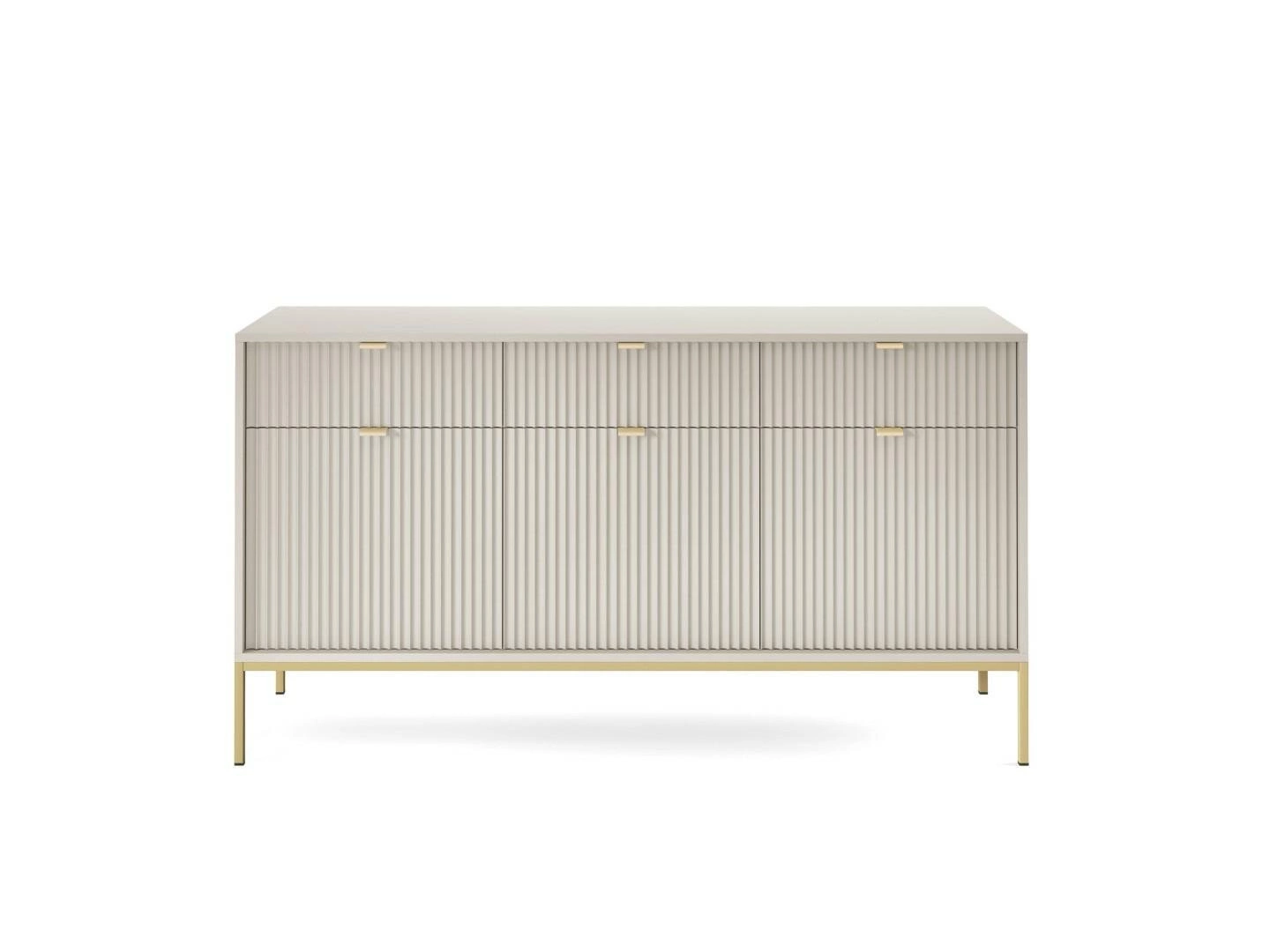Hledáte-li komodu do obývacího pokoje či ložnice, která nejen uschová vaše věci, ale zároveň zaujme svým designem, model Delicious naplní vaše očekávání. Rýhované čelní plochy v béžovém odstínu kašmíru upoutají pozornost a dodávají nábytku jedinečný charakter, skvěle zapadající do glamour nebo moderních interiérů. Zlaté detaily a vysoké, štíhlé nohy podtrhují exkluzivní vzhled, díky čemuž je komoda ozdobou každé místnosti.