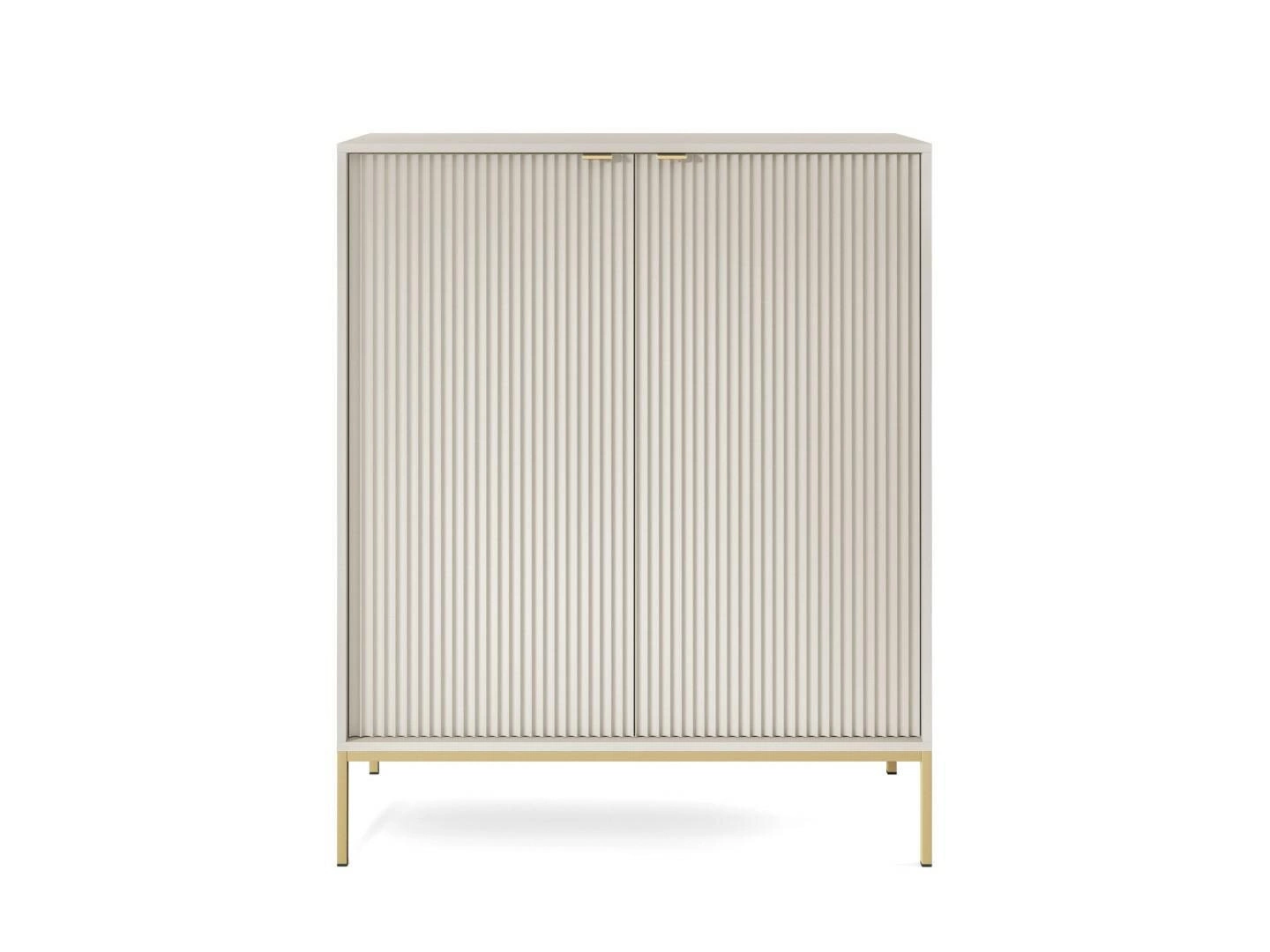 Delicious je moderní komoda, která okamžitě upoutá pozornost svým jemným drážkováním a trendovou barvou kašmíru. Matné čelní plochy skvěle podtrhují glamour styl a zlaté kovové nohy dodávají nábytku lehkost a luxusní vzhled. Vysoká konstrukce působí mimořádně elegantně – perfektně doplní zařízení obývacího pokoje, ložnice nebo reprezentativní chodby.