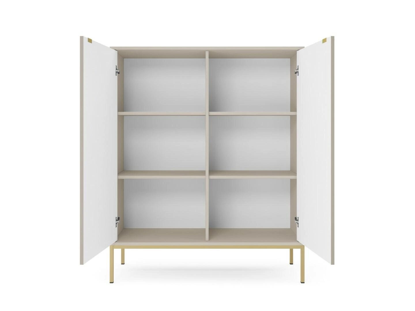 Komoda Delicious od značky Intesi je vysoká, moderní komoda s dekorativním drážkováním v odstínu kašmíru, umístěná na elegantních zlatých nohách. Nábytek má výšku 125 cm a šířku 104 cm, nabízí celkem šest polic a dvě uzavíratelné skříňky. Matný povrch, ozdobné drážkování na čelních stranách a luxusní detaily dělají z této komody skvělou volbu do obývacího pokoje, ložnice i stylové předsíně.