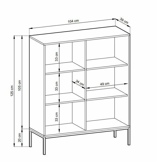 Vysoká komoda Delicious není jen elegantní ozdobou interiéru, ale především praktickým řešením pro uložení věcí. Šest polic a dvě uzavíratelné skříňky umožňují snadno uspořádat oblečení, doplňky nebo dokumenty. Díky šířce 104 cm a hloubce 39 cm získáte dostatek prostoru, přičemž kompaktní rozměry usnadní umístění i v menších místnostech.