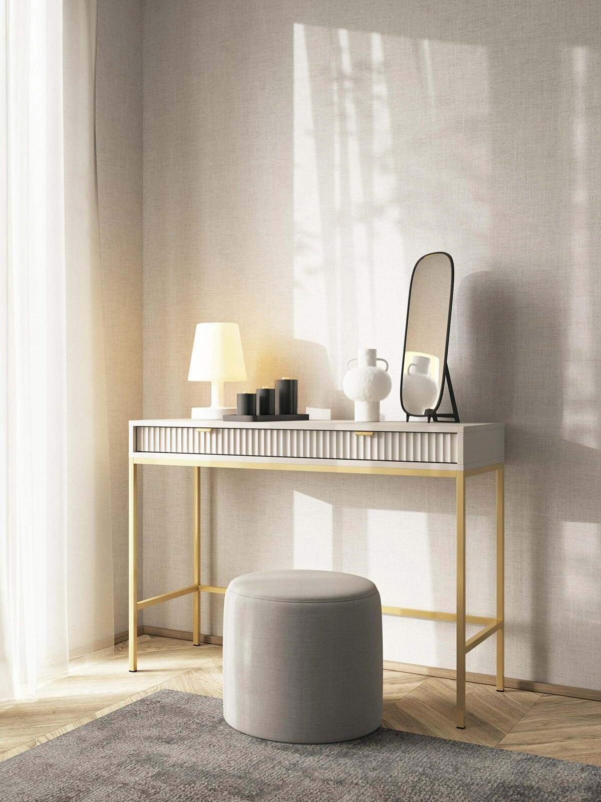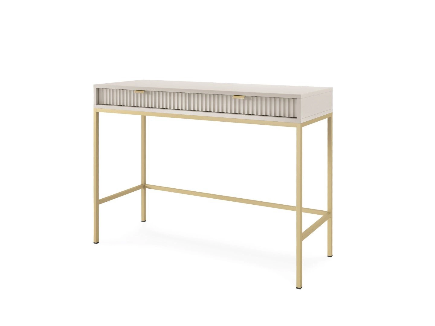 Moderní toaletní stolek Delicious není jen funkčním kusem nábytku, ale také skutečnou ozdobou interiéru. Drážkované, matné čelo v odstínu kašmíru jemně odráží světlo, čímž vytváří dojem hloubky a elegance. Vysoké zlaté nohy dodávají stolku lehkost a zdůrazňují exkluzivní glamour styl, díky čemuž se skvěle hodí do moderních a luxusních interiérů.