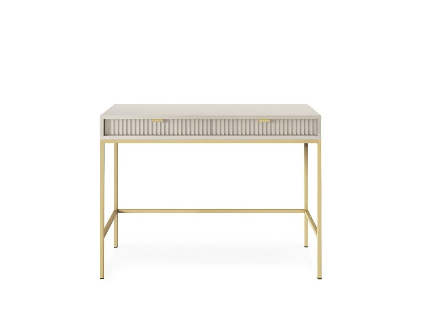 Toaletní stolek Delicious od značky Intesi je elegantní a moderní toaletní stolek do ložnice, jehož drážkované čelo v barvě kašmíru a štíhlé, zlaté nohy dodávají interiéru luxusní vzhled. Vyrobený z odolné nábytkové desky a kovu nabízí šířku 104 cm a výšku 77 cm, což zajišťuje pohodlný prostor pro každodenní kosmetické rituály. Praktické zásuvky pomáhají udržet pořádek v kosmetice a doplňcích, zatímco matný povrch nábytku umožňuje snadné čištění a perfektní vzhled každý den.