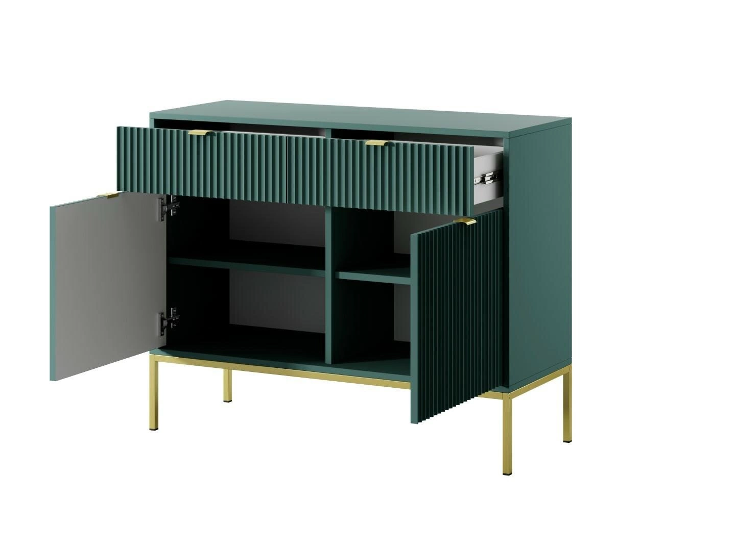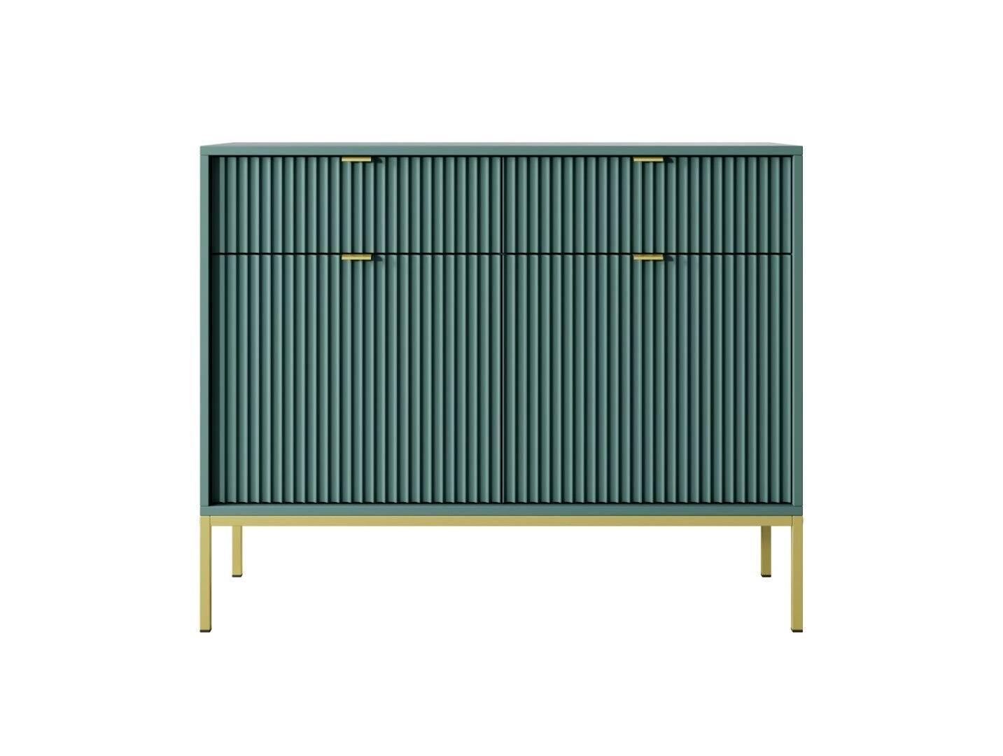 Drážkovaná komoda Delicious zaujme na první pohled originální kombinací matné zelené a štíhlých zlatých nožek. Je to ideální volba pro milovníky industriálního stylu, kteří hledají originalitu i vkusné detaily. Drážkované čelo nejen zdobí, ale také jemně zvýrazňuje strukturu nábytku, čímž dodává komodě hloubku a sofistikovanost. Díky tomu se stává ústředním prvkem každého interiéru, zároveň však skvěle ladí s loftovými i moderními doplňky.