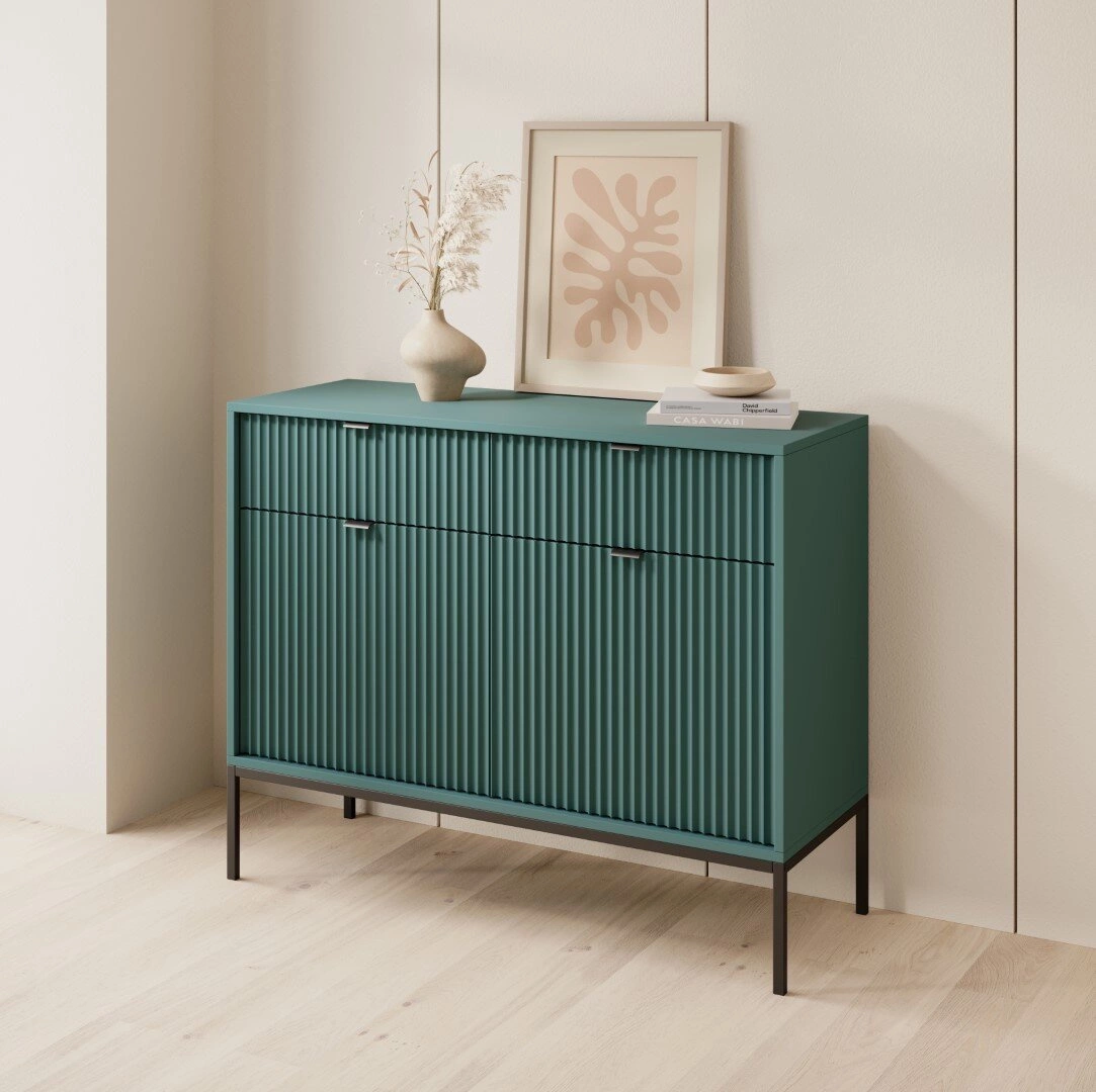 Komoda Delicious ryhovaná zelená 104 cm od značky Intesi je výjimečný kus nábytku do obývacího pokoje, který spojuje moderní design s praktickým využitím. Ryhované čelo v hlubokém, matném odstínu zelené podtrhuje originální charakter komody, zatímco pevná kovová podnož v černé barvě jí dodává lehkost a stabilitu. Model o šířce 104 cm je vybaven prostornými zásuvkami a dvěma skříňkami, díky kterým snadno uspořádáte každodenní předměty.