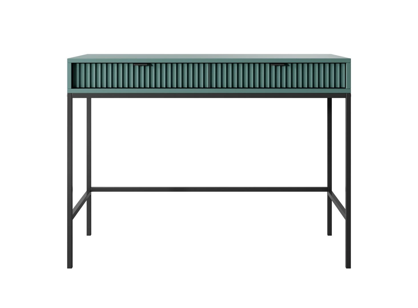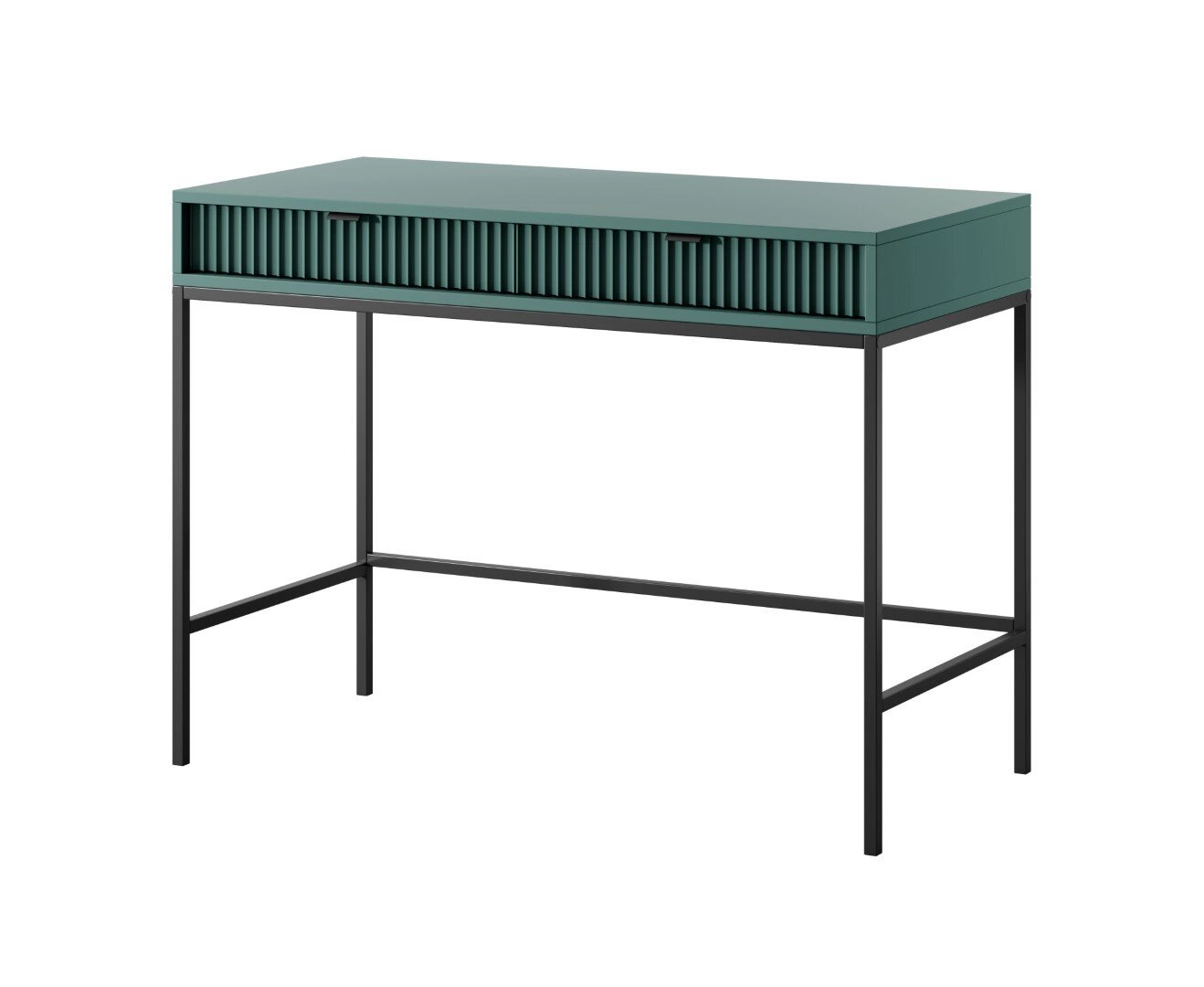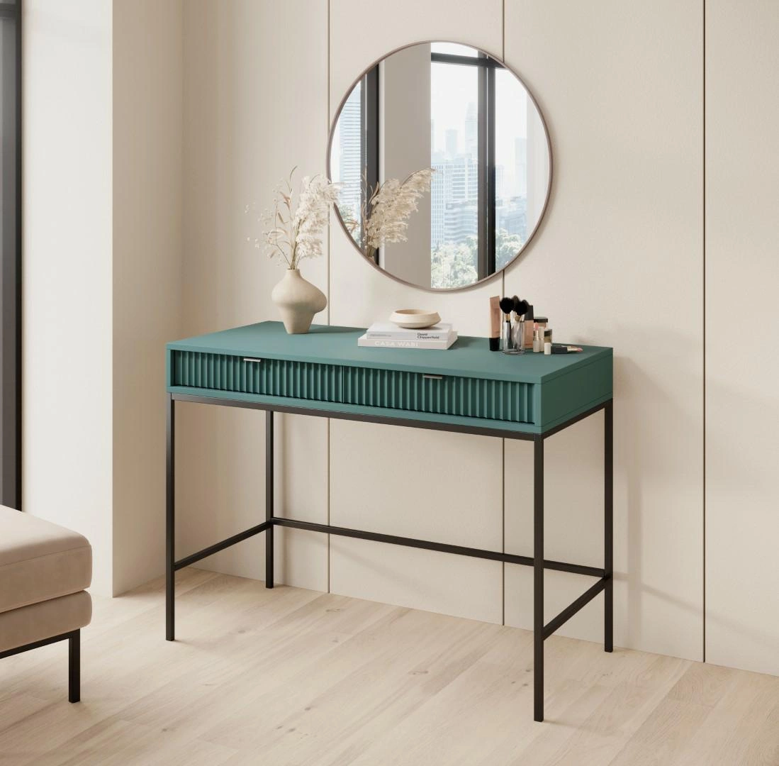 Toaletní stolek Delicious od značky Intesi je moderní a stylový kus nábytku o šířce 104 cm a hloubce 50 cm, který skvěle zapadne jak do ložnice, tak i do studentského pokoje. Ryhované čela zásuvek v intenzivní zelené barvě v kombinaci s černou kovovou podnoží vytvářejí výrazný, ale zároveň minimalistický design, ideální pro interiéry inspirované současnými trendy. Promyšlená konstrukce se dvěma prostornými zásuvkami nabízí pohodlné místo pro uložení kosmetiky, doplňků nebo drobností, díky čemuž je stolek vhodný nejen jako toaletní stolek na make-up, ale také jako praktická úložná konzole.