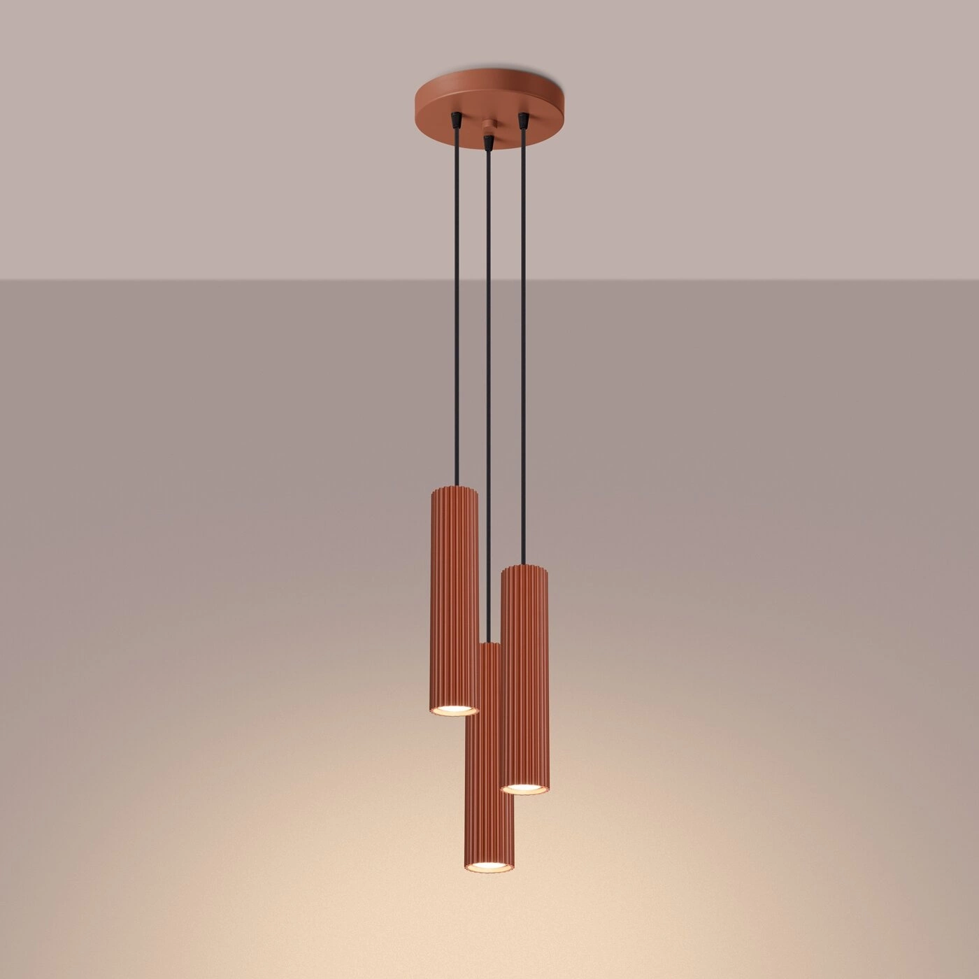 Moderní závěsné svítidlo Karbon 3P od značky SOLLUX LIGHTING je ideální volbou pro ty, kdo hledají minimalistické a zároveň výrazné stropní osvětlení. Vyznačuje se třemi štíhlými stínidly z hliníku v intenzivní červené barvě (terakota), nastavitelnou výškou zavěšení a šířkou 19,5 cm, což z něj dělá perfektní řešení nad jídelní stůl, do obývacího pokoje či jídelny. Třibodová konstrukce umožňuje rovnoměrné rozložení světla a vytváří útulnou atmosféru v moderních interiérech.