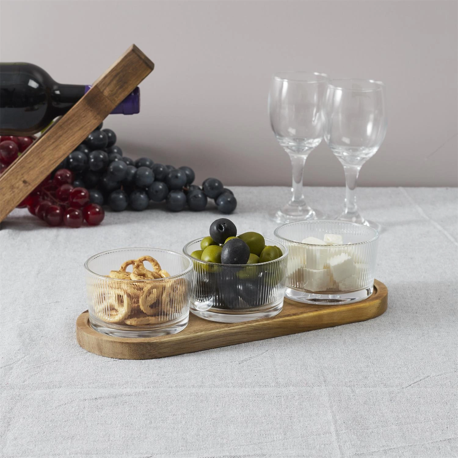 Připravte se na stylové setkání s přáteli nebo rodinou díky sadě na servírování občerstvení z přírodní akácie a skla. Tato sada v sobě spojuje eleganci a funkčnost a skvěle se hodí do každé kuchyně nebo obývacího pokoje. Vyrobeno z akácie, která je nejen esteticky přitažlivá, ale také trvanlivá a odolná proti poškrábání. Skleněné prvky navíc dodávají eleganci a usnadňují servírování nejrůznějších pochutin.