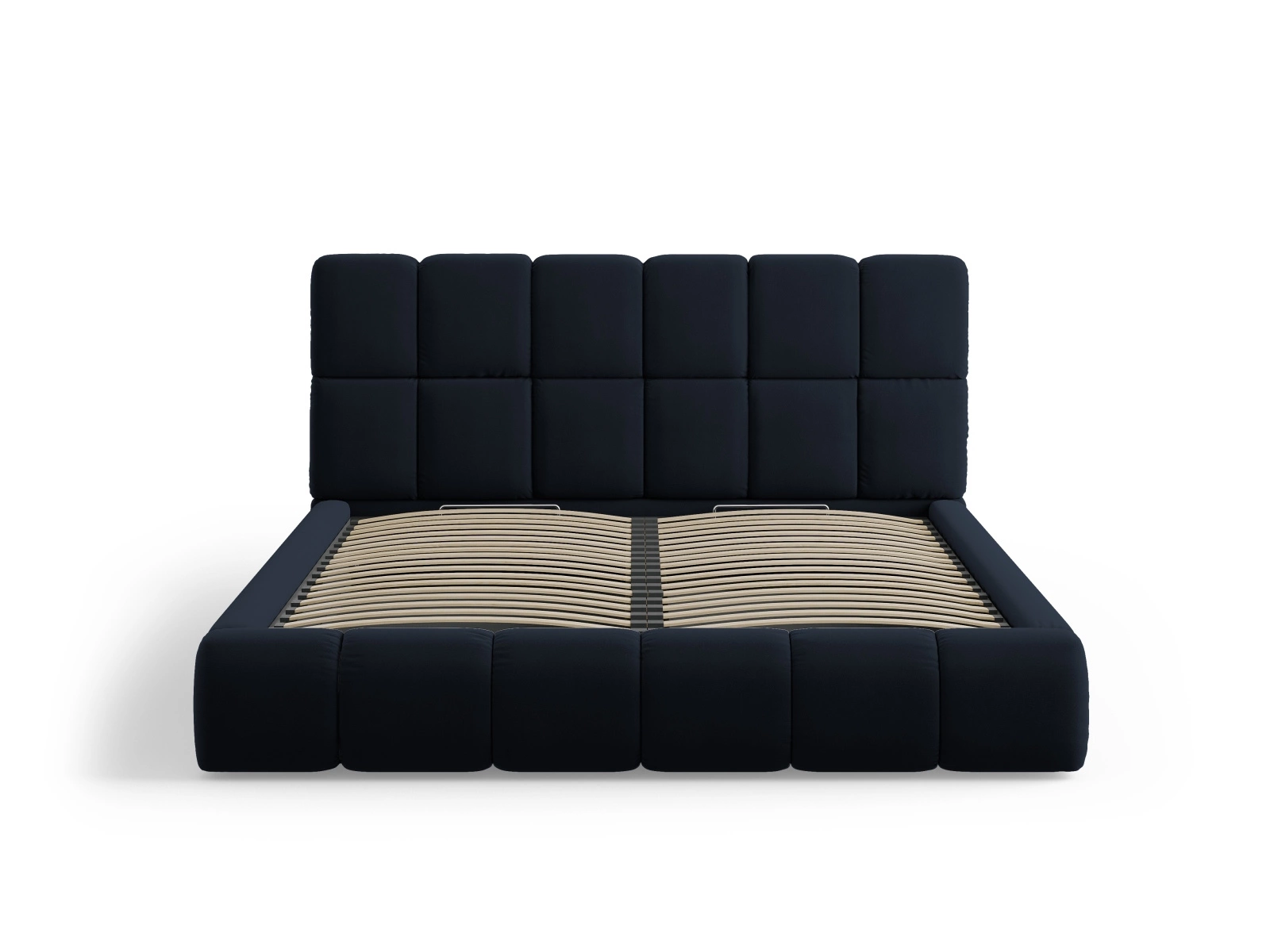 Postel Bellis tmavě modrá sametová 160x200 je moderní čalouněná postel, která spojuje eleganci, funkčnost a pohodlí. Měkká sametová látka v hlubokém modrém odstínu obklopuje pevnou konstrukci a zajišťuje příjemný zážitek každý den. Model je vybaven praktickým úložným prostorem na lůžkoviny a roštem, určený do ložnice s plochou na spaní 160x200 cm – ideální volba pro páry nebo jednotlivce, kteří si cení prostoru a komfortu.