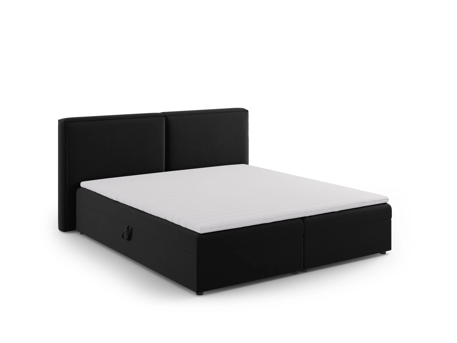 Postel Jodie je čalouněná postel do ložnice o rozměru 160x200 cm, potažená elegantní černou sametovou látkou a vybavená praktickým úložným prostorem na lůžkoviny. Tento model vyniká moderním designem ve stylu glamour, vysokým dekorativním čelem a pevnou konstrukcí z masivního borovicového dřeva. Součástí je také lamelový rošt, který zajišťuje stabilitu a pohodlí při každodenním používání.