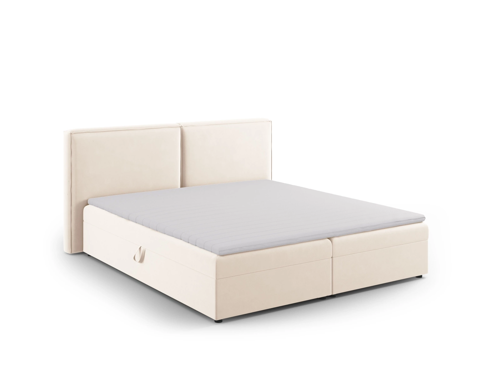 Čalouněná postel Jodie je moderní model s ložnou plochou 180x200 cm, potažený měkkou sametovou látkou ve světle béžovém odstínu. Konstrukce z masivního borového dřeva a úložný prostor na lůžkoviny z ní dělají praktickou a elegantní postel do ložnice, která spojuje glamour styl s každodenním pohodlím. Stabilní rošt zaručuje dlouhou životnost a komfort, zatímco dekorativní detaily podtrhují exkluzivní charakter nábytku.