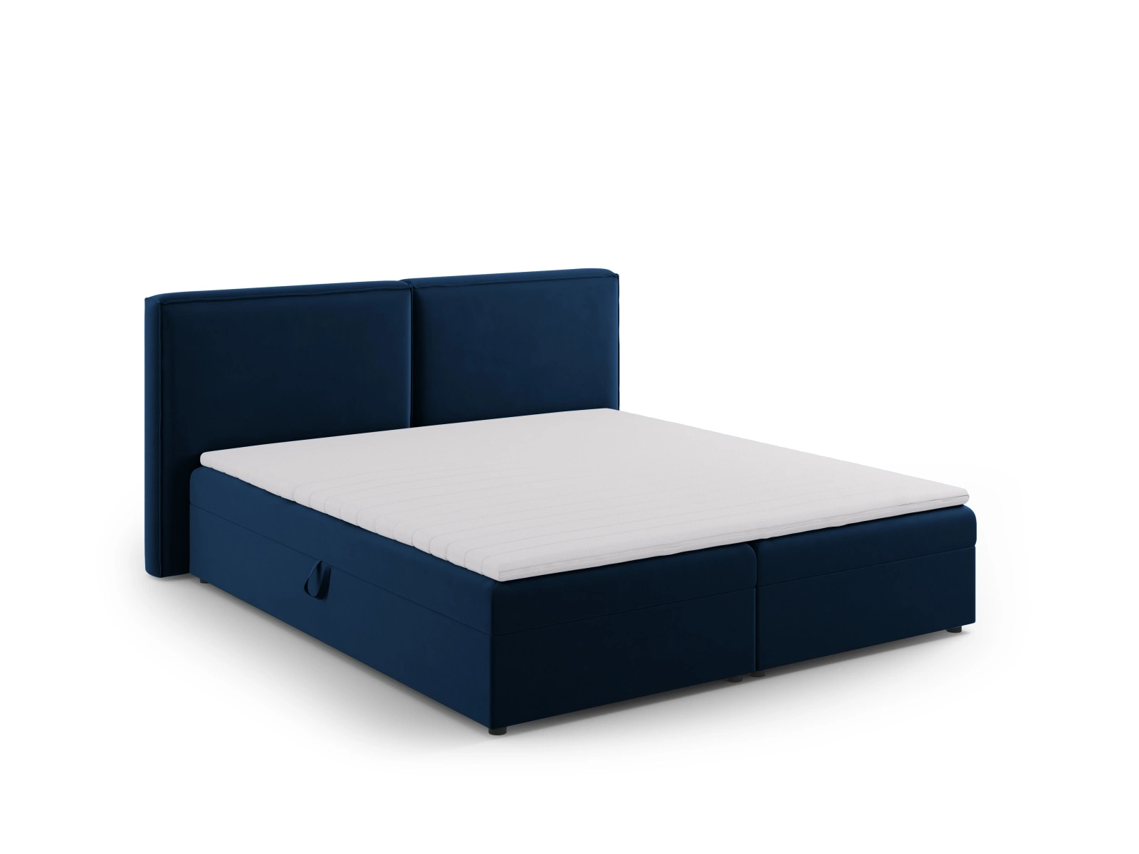 Postel Jodie je moderní čalouněná postel v glamour stylu určená do ložnice, s plochou na spaní 180x200 cm. Je potažená měkkou, sametovou látkou v hluboké modré barvě, vybavená praktickým úložným prostorem na lůžkoviny a pevným roštem. Vysoké čelo postele a decentní nízké nožky podtrhují eleganci a pohodlí používání, čímž vytváří jedinečnou relaxační zónu pro dva.