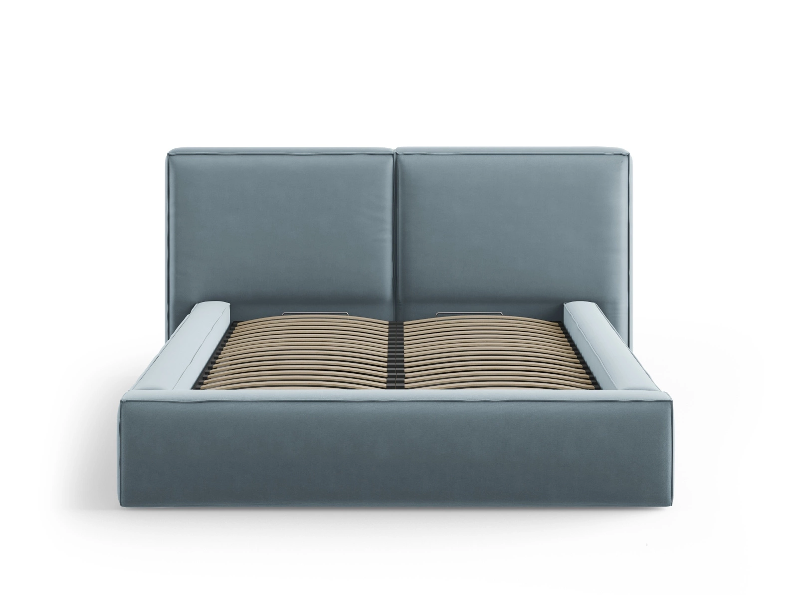 Postel Jodie II je moderní čalouněná postel do ložnice ve světle modré barvě s plochou na spaní 160x200 cm. Je vyrobena z příjemné sametové látky, vybavená prostorným úložným prostorem na lůžkoviny a pevným roštem v ceně. Ideální jako dvoulůžko pro páry, které hledají eleganci, funkčnost a každodenní pohodlí.