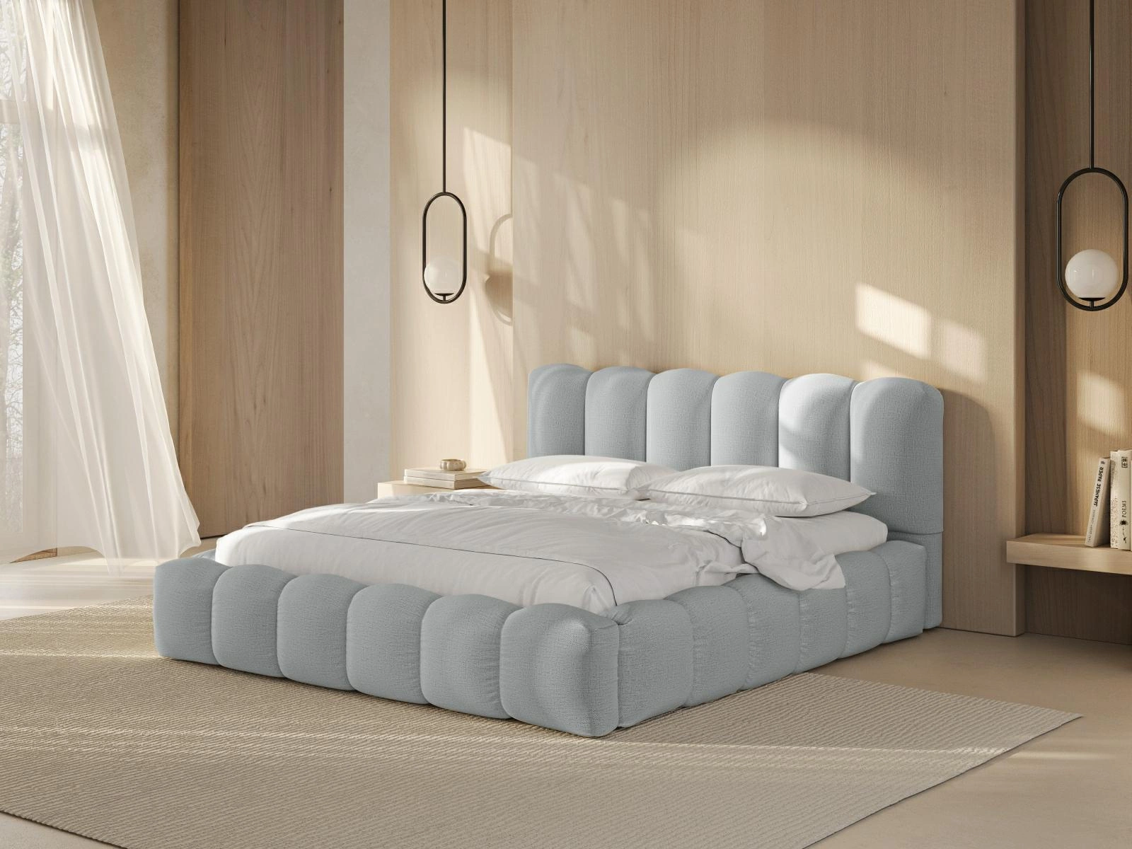 Čalouněná postel Lupine 200x200 je moderní kus nábytku do ložnice, který spojuje styl glamour, velkou spací plochu a praktický úložný prostor na lůžkoviny. Model ve světle šedé barvě, potažený příjemnou látkou Structured Fabric, zajišťuje nejen pohodlný spánek, ale také elegantní vzhled každého interiéru. Součástí sady je pevný rošt, který umožňuje snadné přizpůsobení vhodné matrace.