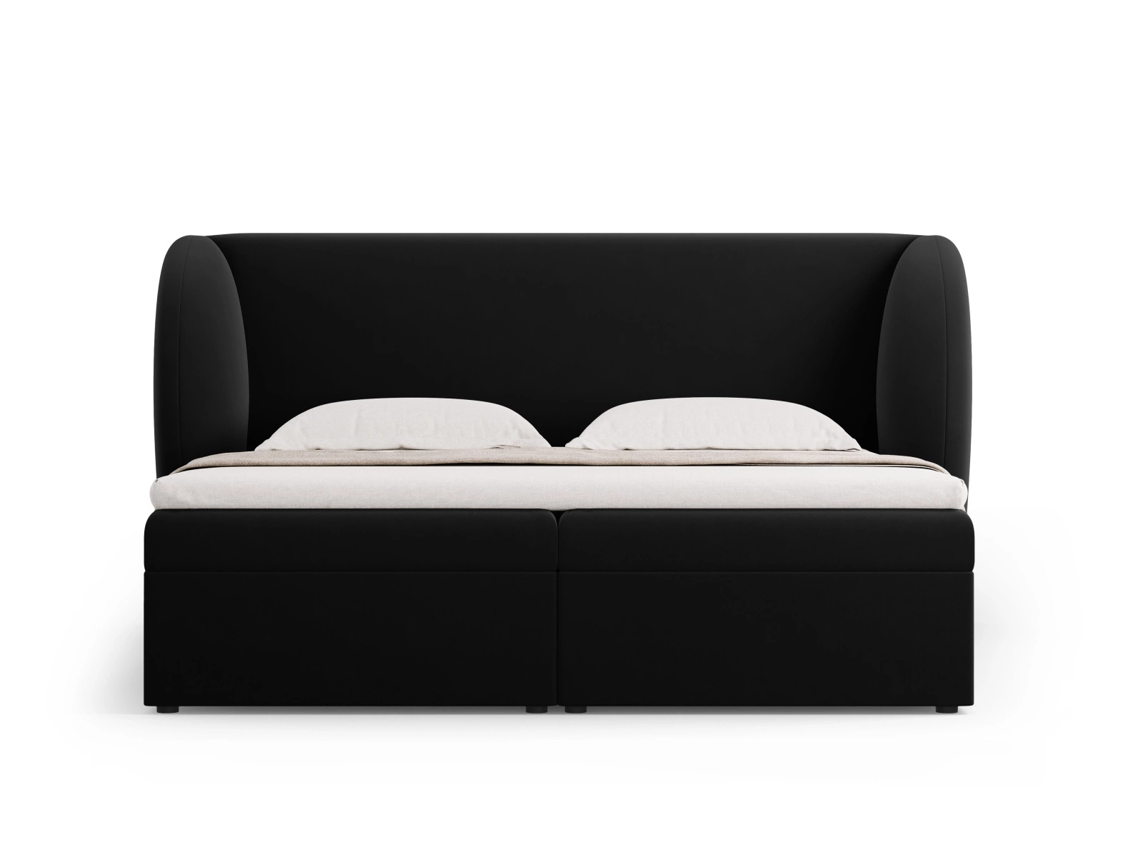 Čalouněná postel Miley je černá, sametová postel 140x200 cm, navržená pro moderní ložnici v glamour stylu. Je vybavena prostorným úložným prostorem na lůžkoviny a pevnou konstrukcí, takže spojuje elegantní design s praktičností. Vysoké, dekorativní čelo postele a měkká sametová látka poskytují výjimečné pohodlí a dodávají interiéru luxusní nádech.
