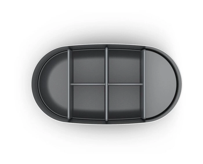 - Oválný tvar a přihrádky – pořádek a snadný přístup ke kartáčkům i pastě