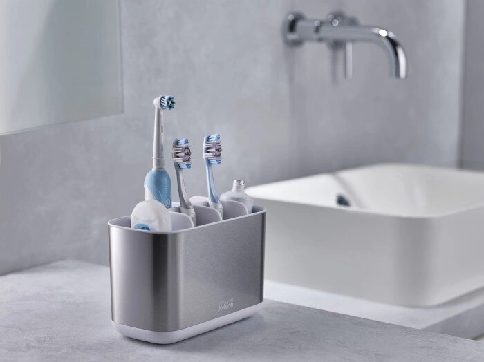Box na zubní kartáčky EasyStore Steel byl navržen s důrazem na pohodlí – několik oddělených přihrádek umožňuje přehledné uložení manuálních i elektrických kartáčků a tuby pasty. Každý člen domácnosti má své místo na kartáček a samostatné sekce pomáhají udržet hygienu i pořádek na umyvadle. Organizér se skvěle hodí pro každodenní použití a umožňuje rychlý přístup ke všem potřebným pomůckám.