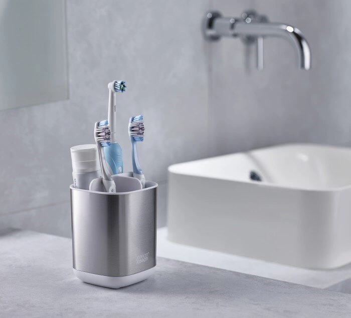 Váš pořádek v koupelně získá nový rozměr s JJ-Bathroom Tote S EasyStore Steel white. Tento praktický organizér je ideálním místem pro uložení zubních kartáčků, klasických i elektrických, a zubní pasty. Je vyroben z odolného plastu, takže vám poskytne spolehlivost a dlouhou životnost.