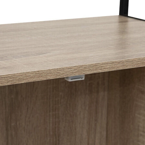 Konstrukce regálu je z oceli lakované do hluboké černé, což zaručuje nejen stabilitu, ale i vysokou odolnost při každodenním používání. Police a čelo skříňky jsou pokryty přírodní dubovou dýhou, díky čemuž celek působí velmi elegantně a zároveň se snadno udržuje v čistotě. Nábytek stojí pevně na čtyřech nohách a polomatný povrch mu dodává na eleganci. Strukturovaný čelní panel skříňky podtrhuje industriální charakter celého regálu.