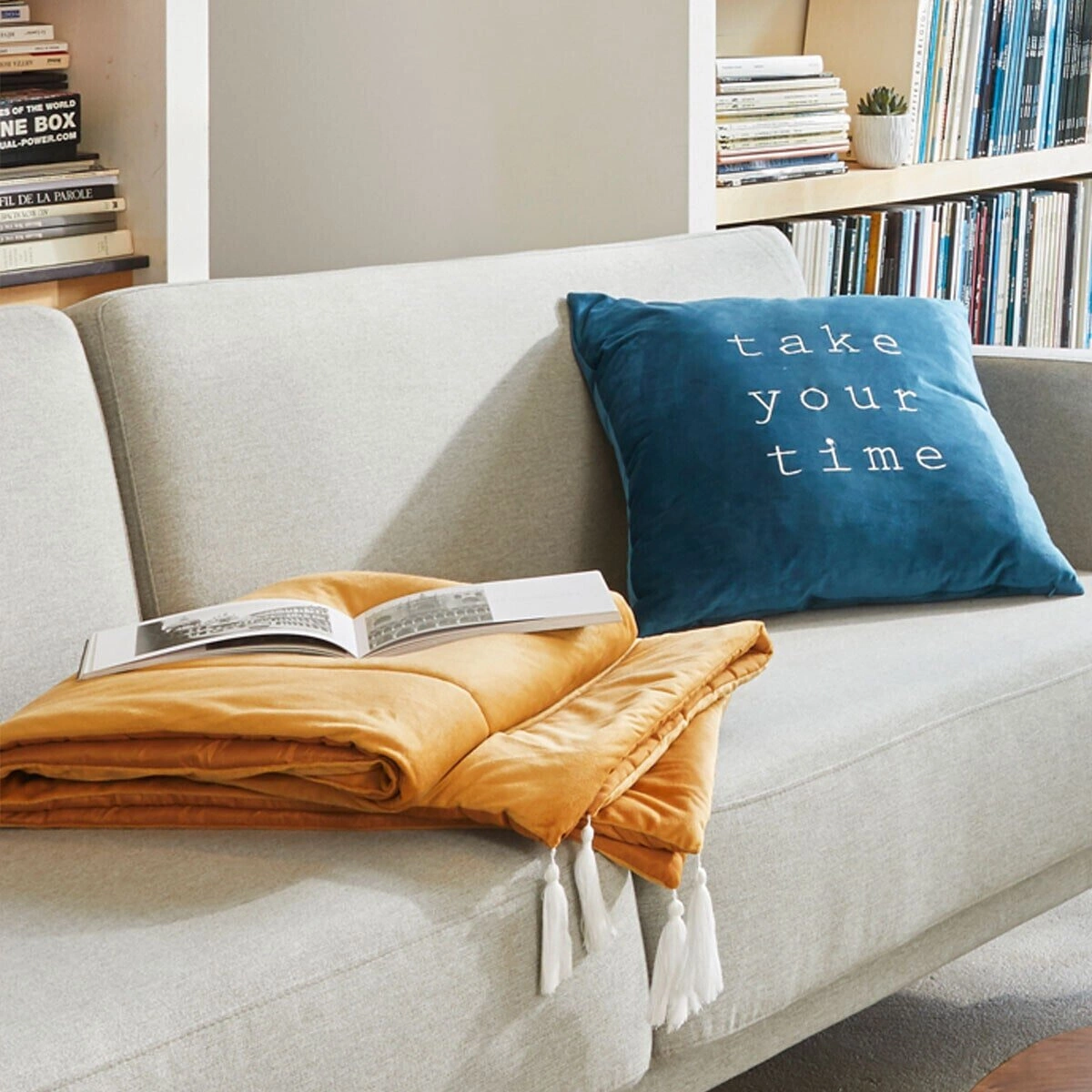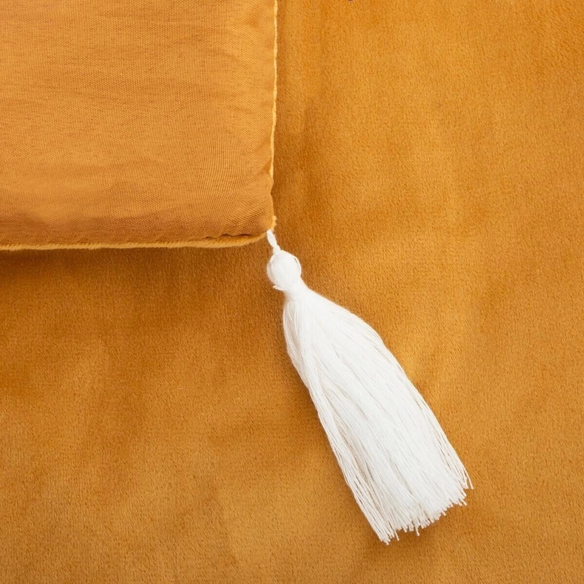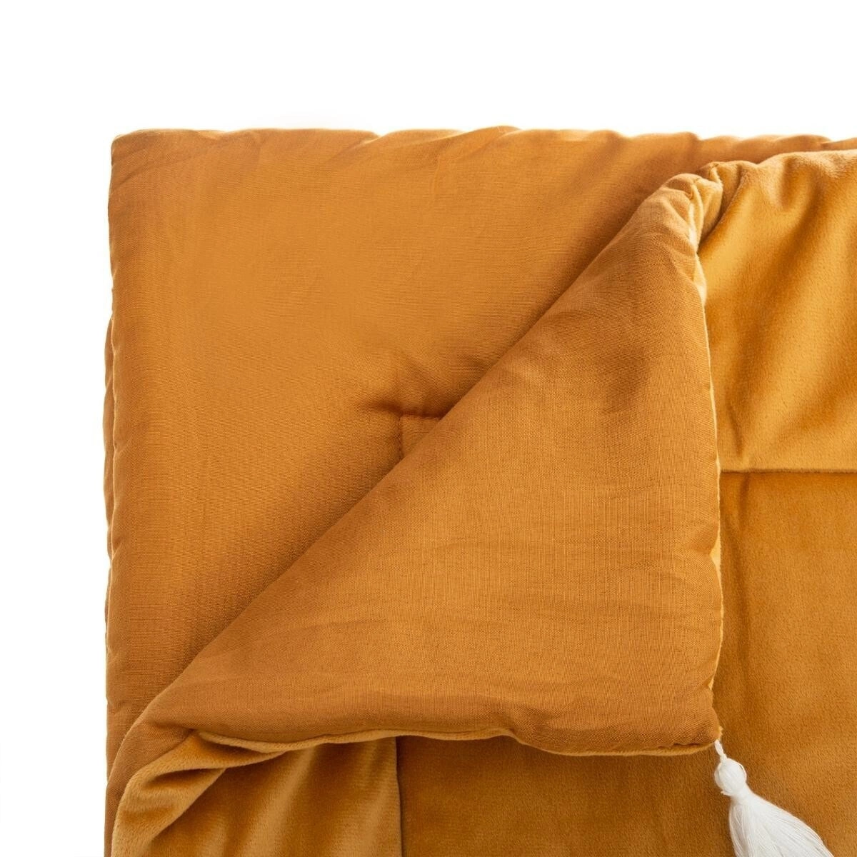 - Okrový sametový přehoz na postel je kombinací funkčnosti a elegance.