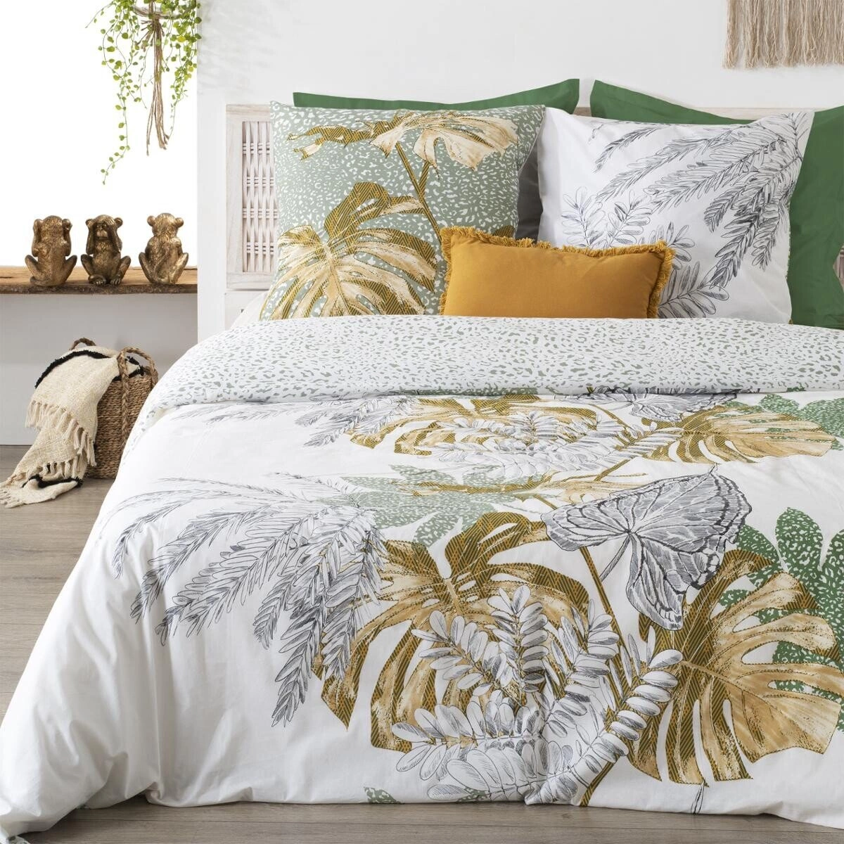 Bavlněné povlečení Monstera 240x220 Atmosphera je ideální volbou pro ty, kteří upřednostňují přírodní materiály, velký rozměr a stylový, oboustranný design. Je vyrobeno ze 100% jemné bavlny a pyšní se certifikátem Oeko-Tex, což zaručuje příjemný dotek a pohodlný spánek každou noc. Klasická bílá barva s botanickým motivem monstery skvěle zapadne do ložnice i studentského pokoje a navodí svěžest a lehkost v interiéru.