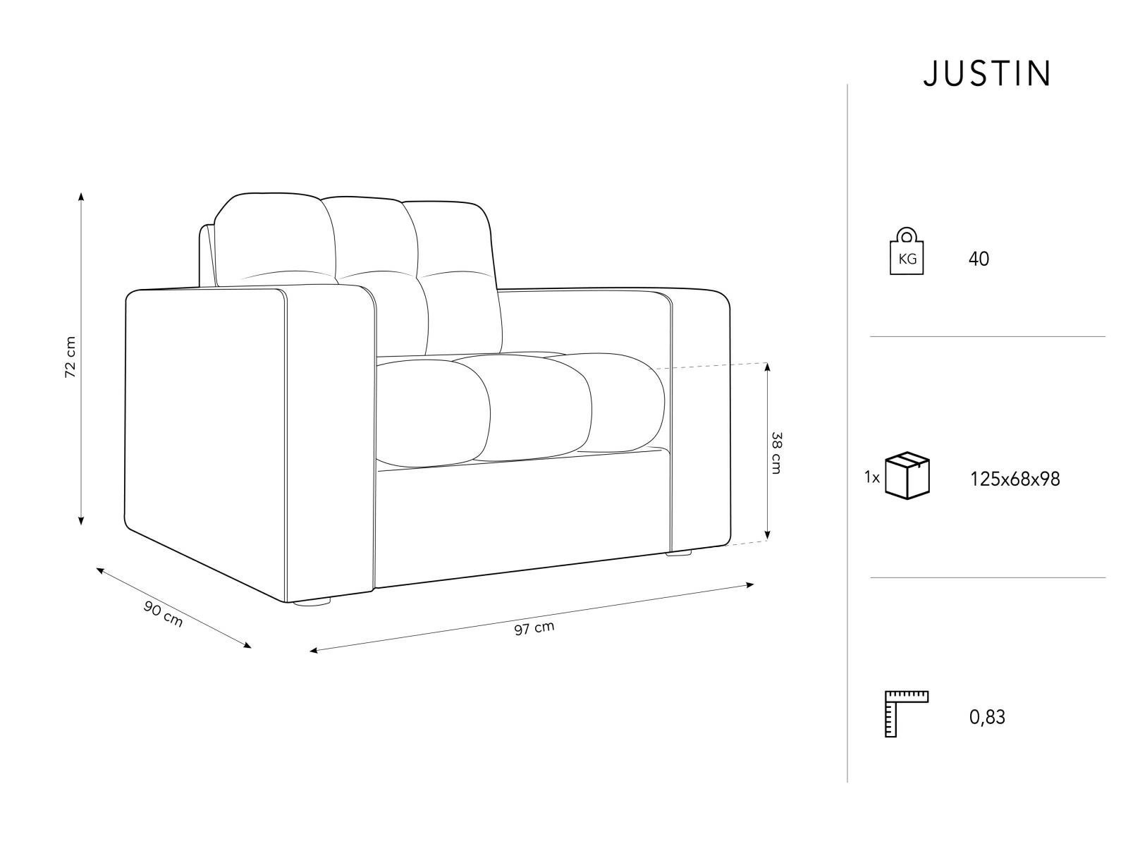 Relaxace v křesle Justin je opravdovým požitkem díky širokému sedáku a měkkému sametovému čalounění. Vysoce elastická pěna a šířka až 90 cm umožňují maximální komfort při sezení, zatímco područky poskytují oporu pro paže během delších chvil odpočinku. Jedinečná struktura látky je příjemná na dotek a snadná na údržbu, což ocení jak členové domácnosti, tak návštěvy.