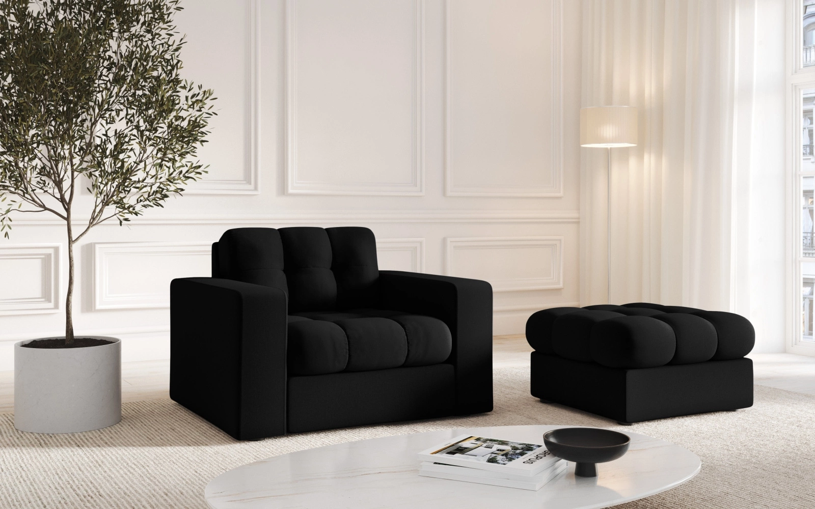 Hledáte-li křeslo do obývacího pokoje, které zaujme na první pohled a zvýší prestiž vašeho interiéru, Justin Black splní vaše očekávání. Moderní silueta s jemně prošívaným opěradlem a sametový povrch v hluboké černi navozují jedinečnou atmosféru luxusu. Šířka 90 cm umožňuje pohodlné posezení, zatímco tvarované područky nabízí perfektní oporu při čtení nebo odpoledním odpočinku.