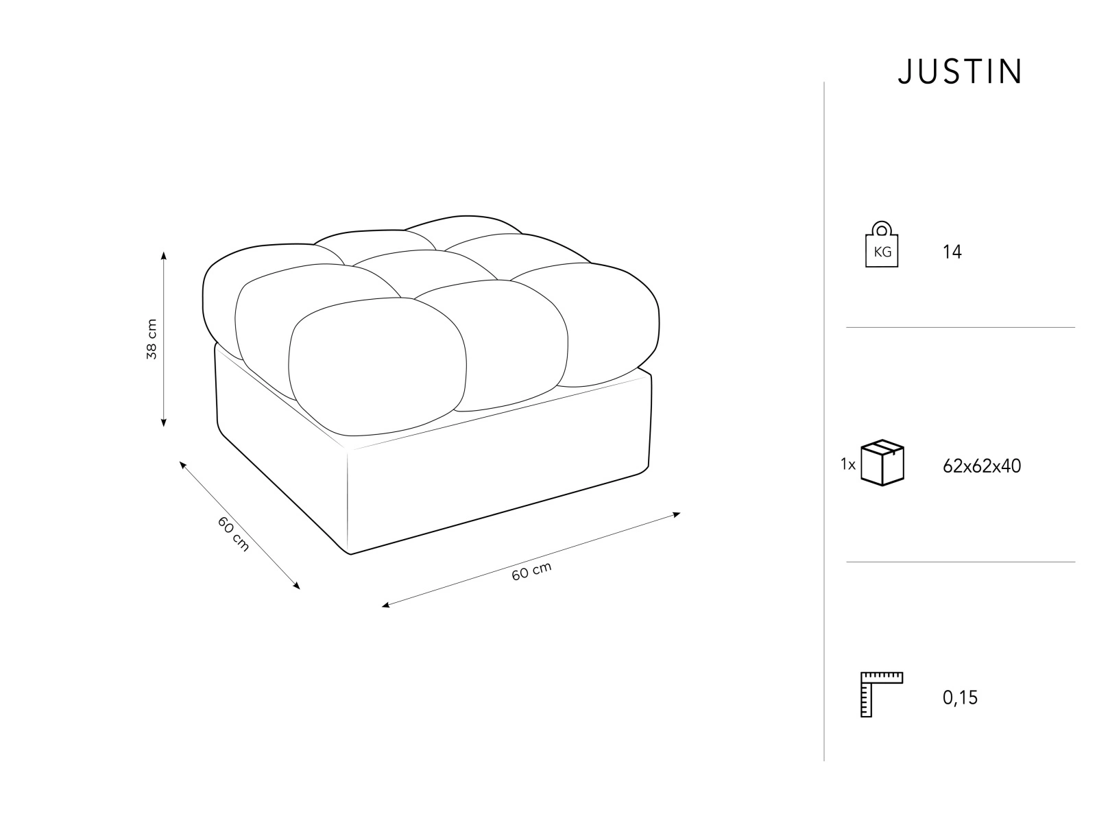 Čtvercový taburet Justin je mnohem víc než jen klasické sezení. Díky svému tvaru a univerzální barvě perfektně ladí jak s minimalistickým, tak i luxusním vybavením domácnosti. Skvěle poslouží jako pohodlná podnožka, další místo k sezení při rodinných setkáních nebo stylový doplněk k toaletnímu stolku. Prošívané provedení zvýrazňuje jeho sofistikovaný charakter, což z něj činí ideální volbu do moderně nebo glamour zařízených prostor.