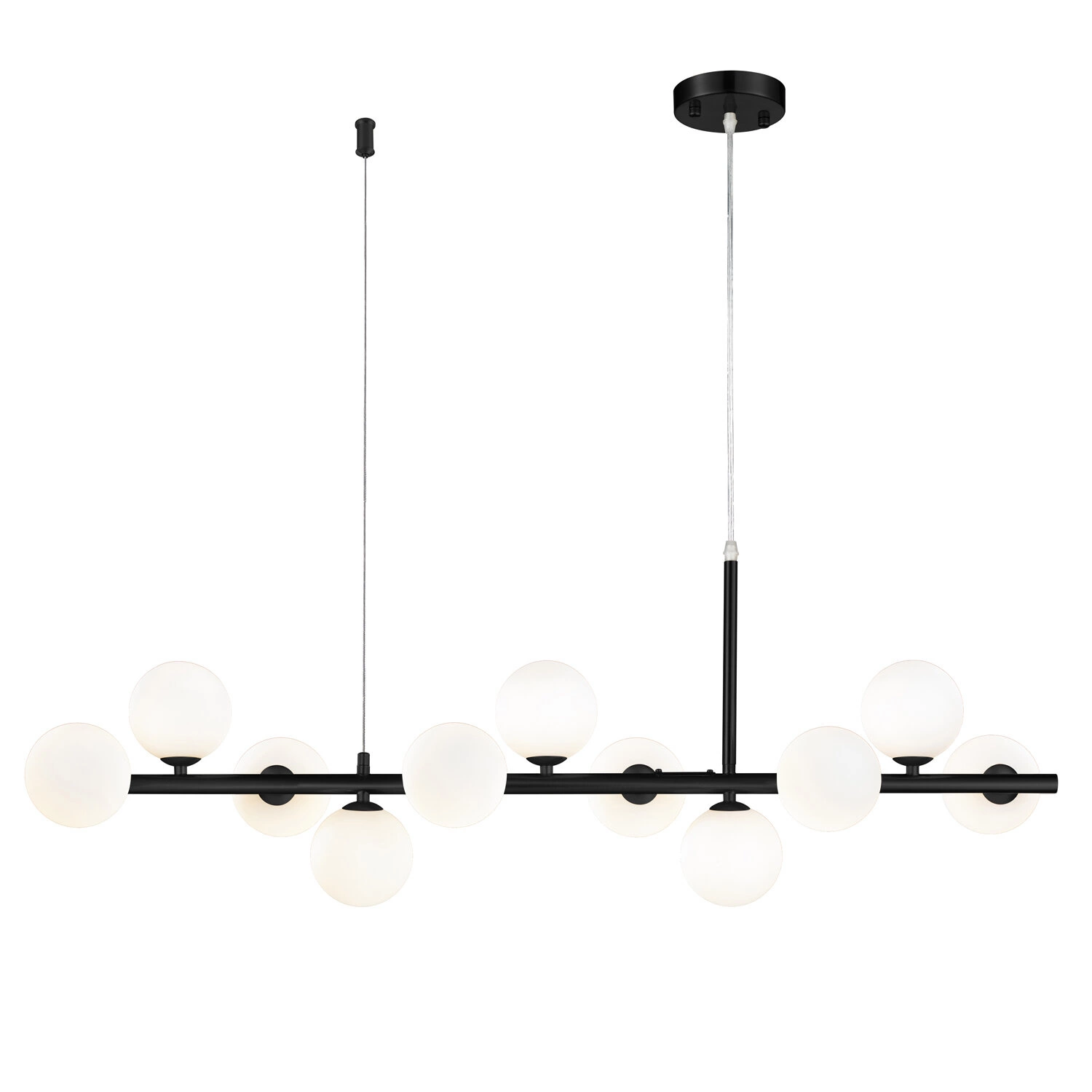 Závěsné svítidlo koule MINI MOON od značky Step into Design je výjimečné stropní osvětlení, které okouzlí moderním stylem i nadčasovou elegancí. Tento model se vyznačuje 11 mléčně bílými skleněnými stínidly upevněnými na černé kovové liště o délce 100 cm a možností nastavení výšky zavěšení až do 120 cm. Je to ideální volba pro vytvoření jemné atmosféry v obývacím pokoji, jídelně, kuchyni nebo nad jídelním stolem – spojuje dekorativní vzhled s praktičností.