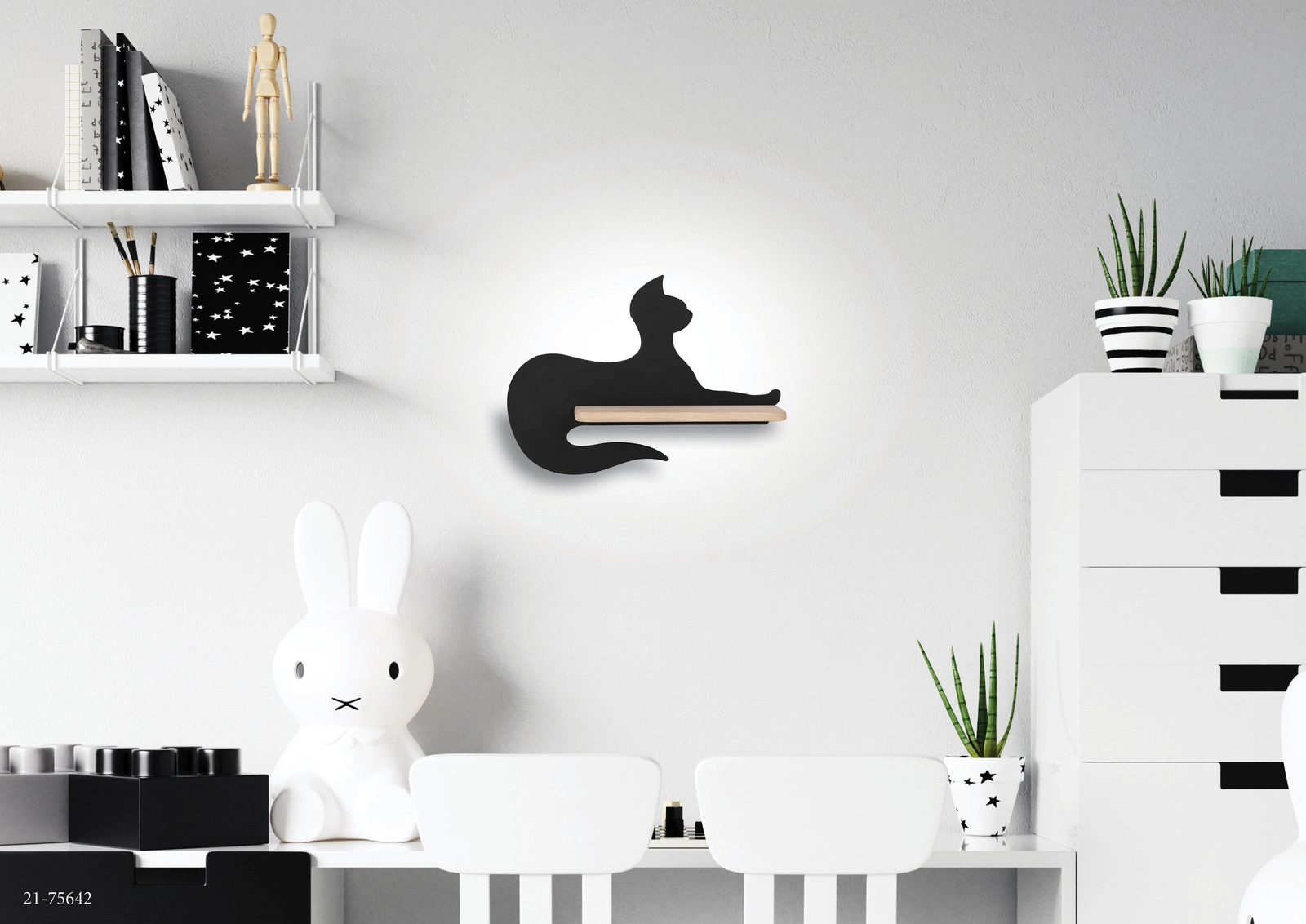 Dřevěné nástěnné LED světlo Cat černé, klasické dětské dekorativní 26 cm