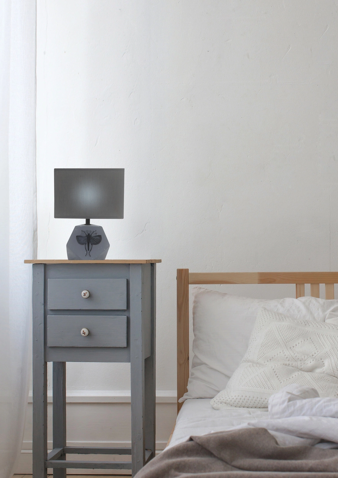 - Šedé textilní stínidlo – změkčuje světlo a navozuje příjemnou atmosféru