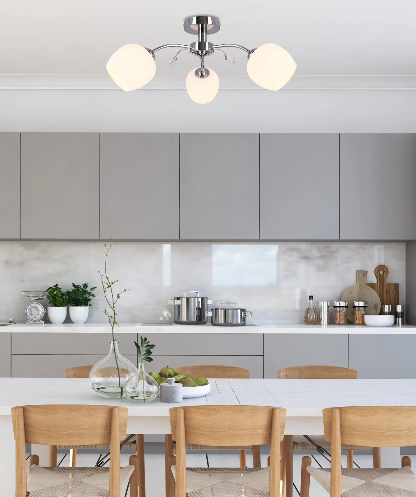 Stropní svítidlo Estar je ideální volbou pro ty, kdo ocení moderní design s prvky glamour. Chromované detaily v kombinaci s bílými stínidly a dekorativními křišťálky vnáší do místnosti eleganci a lehkost. Díky průměru 54 cm se lampa skvěle hodí nad jídelní stůl, do středu obývacího pokoje nebo jako hlavní zdroj světla v ložnici.