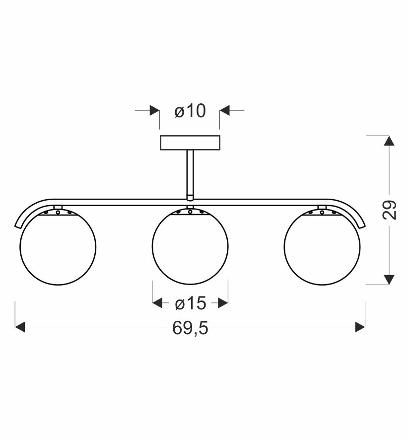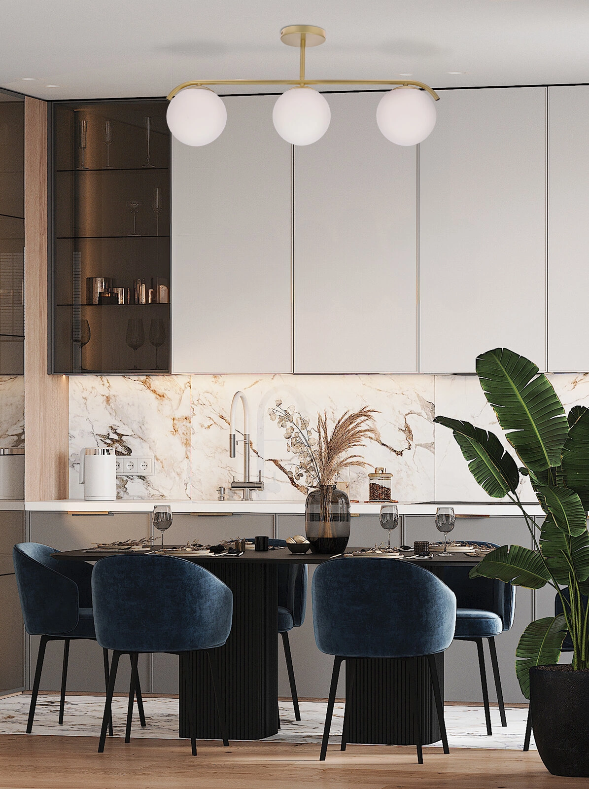 - Tři skleněná stínidla ve tvaru koulí – rovnoměrné, příjemné světlo a působivý vzhled
